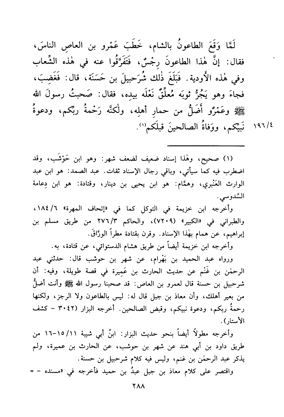 لَمَّا وَقَعَ الطَّاعُونُ بِالشَّامِ، خَطَبَ عَمْرُو بْنُ الْعَاصِ النَّاسَ، فَقَالَ: إِنَّ هَذَا الطَّاعُونَ رِجْسٌ، فَتَفَرَّقُوا عَنْهُ فِي هَذِهِ الشِّعَابِ وَفِي هَذِهِ الْأَوْدِيَةِ، فَبَلَغَ ذَلِكَ شُرَحْبِيلَ بْنَ حَسَنَةَ قَالَ: فَغَضِبَ فَجَاءَ وَهُوَ يَجُرُّ ثَوْبَهُ مُعَلِّقٌ نَعْلَهُ بِيَدِهِ، فَقَالَ: " صَحِبْتُ رَسُولَ اللهِ صَلَّى اللهُ عَلَيْهِ وَسَلَّمَ، وَعَمْرٌو أَضَلُّ مِنْ حِمَارِ أَهْلِهِ، وَلَكِنَّهُ رَحْمَةُ رَبِّكُمْ، وَدَعْوَةُ نَبِيِّكُمْ، وَوَفَاةُ الصَّالِحِينَ قَبْلَكُمْ " (١)
