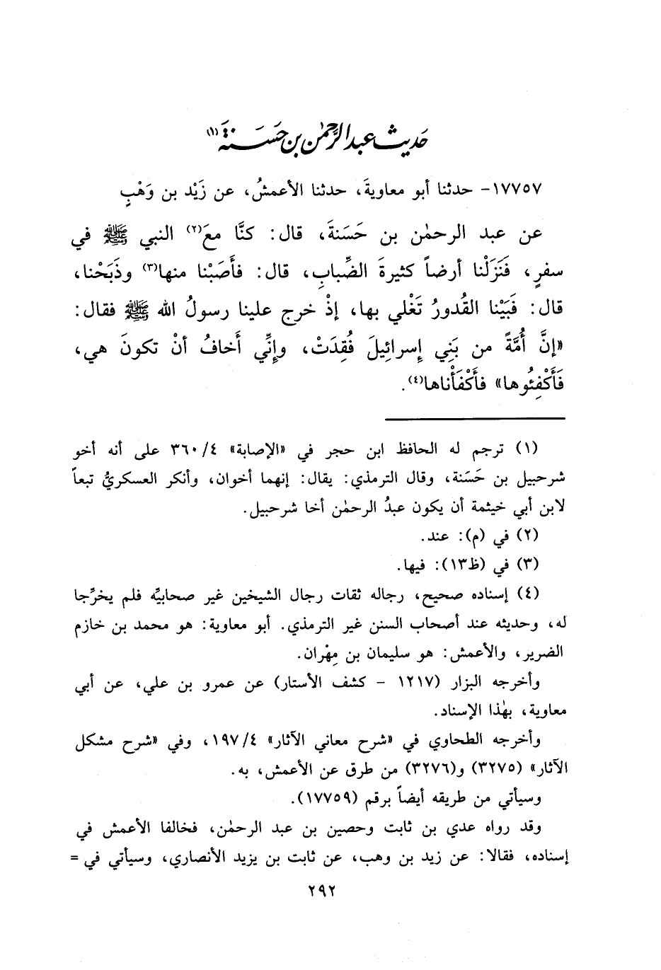 ١٧٧٥٧ - حَدَّثَنَا أَبُو مُعَاوِيَةَ، حَدَّثَنَا الْأَعْمَشُ، عَنْ زَيْدِ بْنِ وَهْبٍ، عَنْ عَبْدِ الرَّحْمَنِ بْنِ حَسَنَةَ، قَالَ: كُنَّا مَعَ (٢) النَّبِيِّ صَلَّى اللهُ عَلَيْهِ وَسَلَّمَ فِي سَفَرٍ، فَنَزَلْنَا أَرْضًا كَثِيرَةَ الضِّبَابِ، قَالَ: فَأَصَبْنَا مِنْهَا (٣) وَذَبَحْنَا، قَالَ: فَبَيْنَا الْقُدُورُ تَغْلِي بِهَا، إِذْ خَرَجَ عَلَيْنَا رَسُولُ اللهِ صَلَّى اللهُ عَلَيْهِ وَسَلَّمَ، فَقَالَ: " إِنَّ أُمَّةً مِنْ بَنِي إِسْرَائِيلَ فُقِدَتْ، وَإِنِّي أَخَافُ أَنْ تَكُونَ هِيَ فَأَكْفِئُوهَا فَأَكْفَأْنَاهَا " (٤)