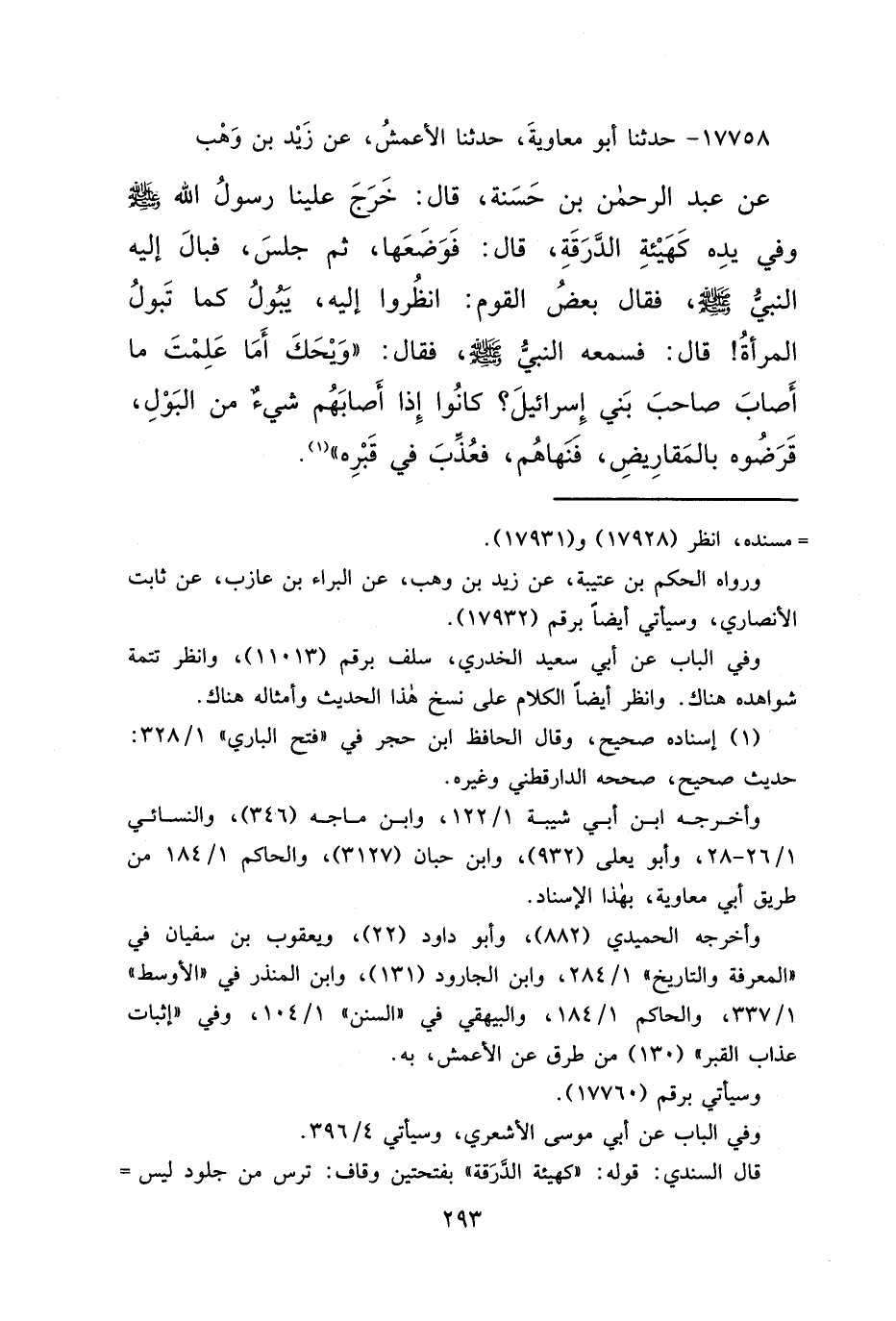 ١٧٧٥٨ - حَدَّثَنَا أَبُو مُعَاوِيَةَ، حَدَّثَنَا الْأَعْمَشُ، عَنْ زَيْدِ بْنِ وَهْبٍ، عَنْ عَبْدِ الرَّحْمَنِ بْنِ حَسَنَةَ، قَالَ: خَرَجَ عَلَيْنَا رَسُولُ اللهِ صَلَّى اللهُ عَلَيْهِ وَسَلَّمَ وَفِي يَدِهِ كَهَيْئَةِ الدَّرَقَةِ، قَالَ: فَوَضَعَهَا، ثُمَّ جَلَسَ، فَبَالَ إِلَيْهِ النَّبِيُّ صَلَّى اللهُ عَلَيْهِ وَسَلَّمَ، فَقَالَ بَعْضُ الْقَوْمِ: انْظُرُوا إِلَيْهِ يَبُولُ كَمَا تَبُولُ الْمَرْأَةُ، قَالَ: فَسَمِعَهُ النَّبِيُّ صَلَّى اللهُ عَلَيْهِ وَسَلَّمَ فَقَالَ: " وَيْحَكَ أَمَا عَلِمْتَ مَا أَصَابَ صَاحِبَ بَنِي إِسْرَائِيلَ؟ كَانُوا إِذَا أَصَابَهُمْ شَيْءٌ مِنَ الْبَوْلِ، قَرَضُوهُ بِالْمَقَارِيضِ، فَنَهَاهُمْ، فَعُذِّبَ فِي قَبْرِهِ " (١)