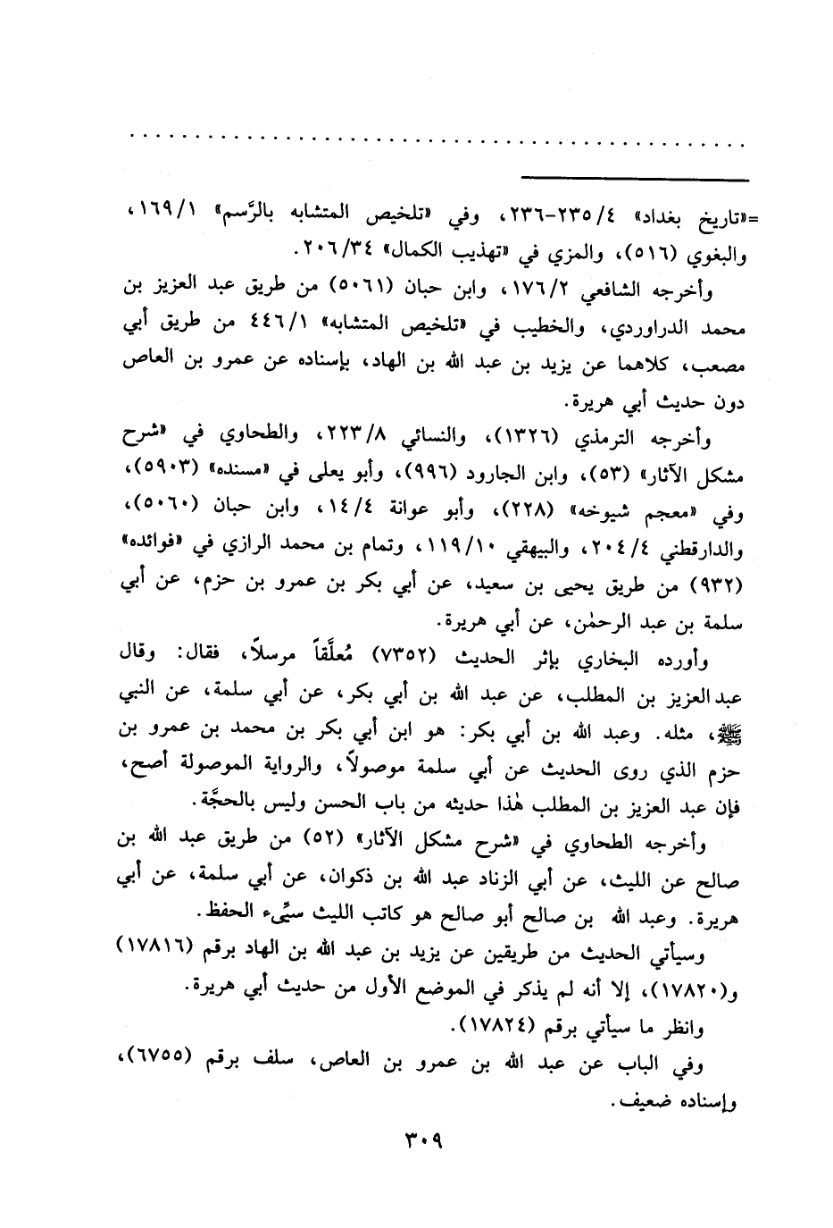 وأورده البخاري باثر الحديث (٧٣٥٢) مُعلَّقاً مرسلاً، فقال: وقال عبد العزيز بن المطلب، عن عبد الله بن أبي بكر، عن أبي سلمة، عن النبي صَلَّى اللهُ عَلَيْهِ وَسَلَّمَ، مثله. وعبد الله بن أبي بكر: هو ابن أبي بكر بن محمد بن عمرو بن حزم الذي روى الحديث عن أبي سلمة موصولاً، والرواية الموصولة أصح، فإن عبد العزيز بن المطلب هذا حديثه من باب الحسن وليس بالحجة.