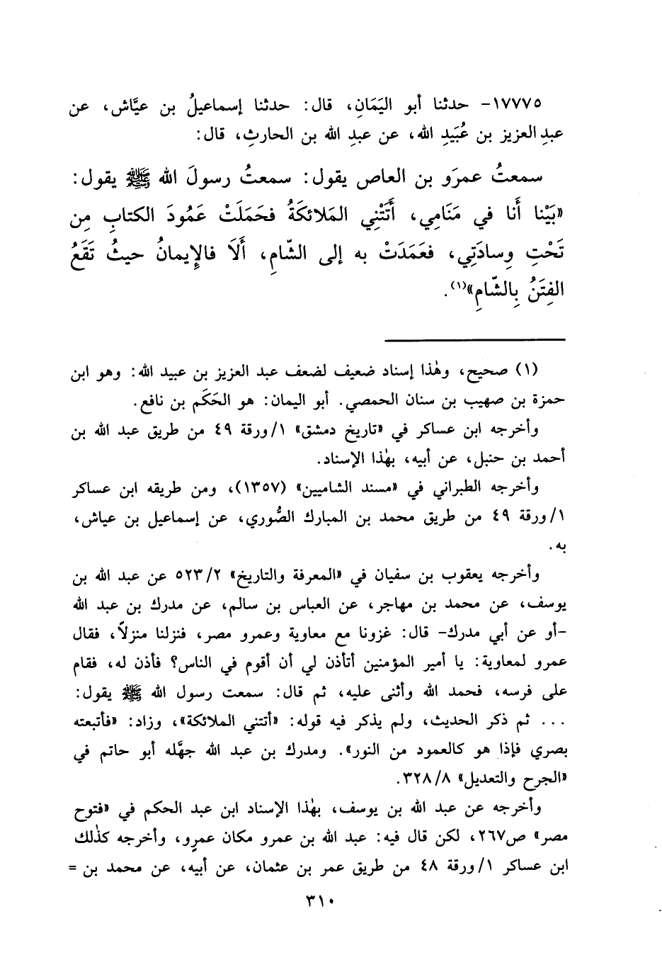 ١٧٧٧٥ - حَدَّثَنَا أَبُو الْيَمَانِ، قَالَ: حَدَّثَنَا إِسْمَاعِيلُ بْنُ عَيَّاشٍ، عَنْ عَبْدِ الْعَزِيزِ بْنِ عُبَيْدِ اللهِ، عَنْ عَبْدِ اللهِ بْنِ الْحَارِثِ، قَالَ: سَمِعْتُ عَمْرَو بْنَ الْعَاصِ يَقُولُ: سَمِعْتُ رَسُولَ اللهِ صَلَّى اللهُ عَلَيْهِ وَسَلَّمَ يَقُولُ: " بَيْنَا أَنَا فِي مَنَامِي، أَتَتْنِي الْمَلَائِكَةُ فَحَمَلَتْ عَمُودَ الْكِتَابِ مِنْ تَحْتِ وِسَادَتِي، فَعَمَدَتْ بِهِ إِلَى الشَّامِ، أَلَا فَالْإِيمَانُ حَيْثُ تَقَعُ الْفِتَنُ بِالشَّامِ " (١)
