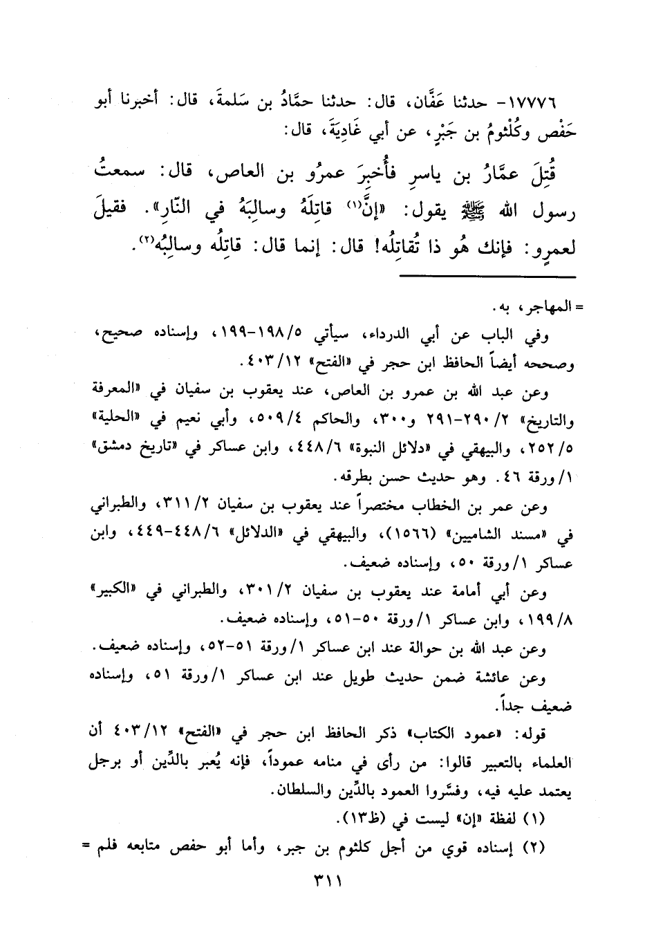 ١٧٧٧٦ - حَدَّثَنَا عَفَّانُ، قَالَ: حَدَّثَنَا حَمَّادُ بْنُ سَلَمَةَ، قَالَ: أَخْبَرَنَا أَبُو حَفْصٍ، وَكُلْثُومُ بْنُ جَبْرٍ، عَنْ أَبِي غَادِيَةَ، قَالَ: قُتِلَ عَمَّارُ بْنُ يَاسِرٍ فَأُخْبِرَ عَمْرُو بْنُ الْعَاصِ، قَالَ: سَمِعْتُ رَسُولَ اللهِ صَلَّى اللهُ عَلَيْهِ وَسَلَّمَ يَقُولُ: " إِنَّ (١) قَاتِلَهُ، وَسَالِبَهُ فِي النَّارِ "، فَقِيلَ لِعَمْرٍو: فَإِنَّكَ هُوَ ذَا تُقَاتِلُهُ، قَالَ: إِنَّمَا قَالَ: قَاتِلَهُ، وَسَالِبَهُ (٢)