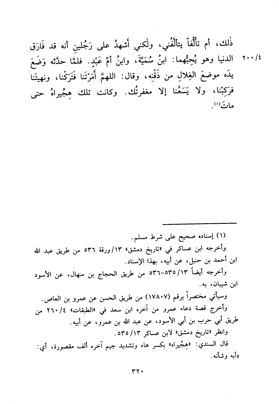 ذَلِكَ، أَمْ تَأَلُّفًا يَتَأَلَّفُنِي، وَلَكِنِّي أَشْهَدُ عَلَى رَجُلَيْنِ أَنَّهُ قَدْ فَارَقَ الدُّنْيَا وَهُوَ يُحِبُّهُمَا: ابْنُ سُمَيَّةَ، وَابْنُ أُمِّ عَبْدٍ، فَلَمَّا حَدَّثَهُ وَضَعَ يَدَهُ مَوْضِعَ الْغِلَالِ مِنْ ذَقْنِهِ وَقَالَ: اللهُمَّ أَمَرْتَنَا فَتَرَكْنَا، وَنَهَيْتَنَا فَرَكِبْنَا، وَلَا يَسَعُنَا إِلَّا مَغْفِرَتُكَ، وَكَانَتْ تِلْكَ هِجِّيرَاهُ حَتَّى مَاتَ (١)