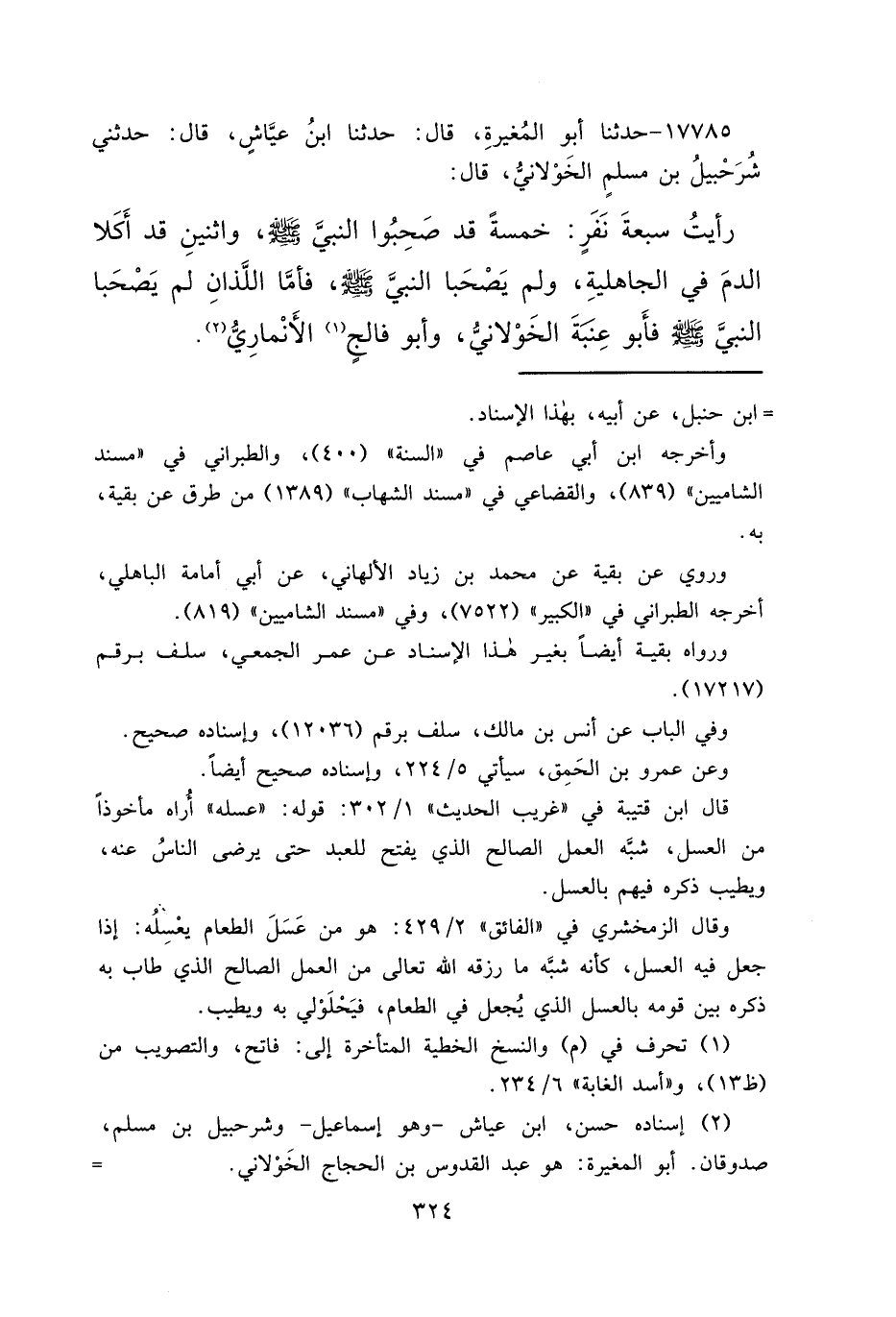١٧٧٨٥ - حَدَّثَنَا أَبُو الْمُغِيرَةِ، قَالَ: حَدَّثَنَا ابْنُ عَيَّاشٍ، قَالَ: حَدَّثَنِي شُرَحْبِيلُ بْنُ مُسْلِمٍ الْخَوْلَانِيُّ، قَالَ: " رَأَيْتُ سَبْعَةَ نَفَرٍ خَمْسَةً قَدْ صَحِبُوا النَّبِيَّ صَلَّى اللهُ عَلَيْهِ وَسَلَّمَ، وَاثْنَيْنِ قَدْ أَكَلَا الدَّمَ فِي الْجَاهِلِيَّةِ، وَلَمْ يَصْحَبَا النَّبِيَّ صَلَّى اللهُ عَلَيْهِ وَسَلَّمَ، فَأَمَّا اللَّذَانِ لَمْ يَصْحَبَا النَّبِيَّ صَلَّى اللهُ عَلَيْهِ وَسَلَّمَ فَأَبُو عِنَبَةَ الْخَوْلَانِيُّ، وَأَبُو فَالِجٍ (١) الْأَنْمَارِيُّ " (٢)