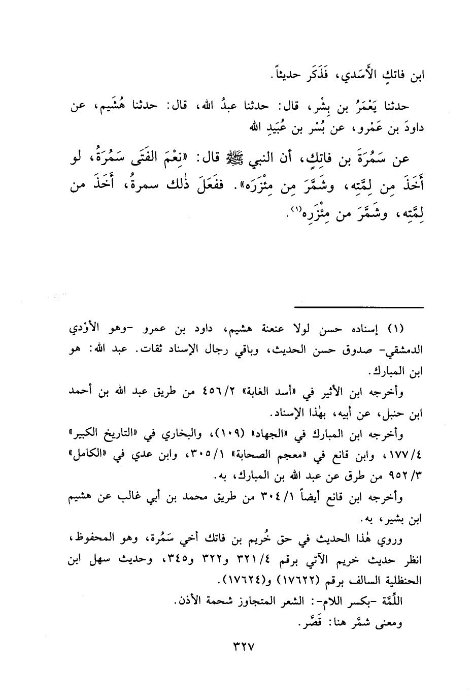 بْنِ فَاتِكٍ الْأَسَدِيِّ، فَذَكَرَ حَدِيثًا قَالَ: حَدَّثَنَا يَعْمَرُ بْنُ بِشْرٍ، قَالَ: حَدَّثَنَا عَبْدُ اللهِ، قَالَ: حَدَّثَنَا هُشَيْمٌ، عَنْ دَاوُدَ بْنِ عَمْرٍو، عَنْ بُسْرِ بْنِ عُبَيْدِ اللهِ، عَنْ سَمُرَةَ بْنِ فَاتِكٍ، أَنَّ النَّبِيَّ صَلَّى اللهُ عَلَيْهِ وَسَلَّمَ قَالَ: " نِعْمَ الْفَتَى سَمُرَةُ، لَوْ أَخَذَ مِنْ لِمَّتِهِ، وَشَمَّرَ مِنْ مِئْزَرِهِ " " فَفَعَلَ ذَلِكَ سَمُرَةُ أَخَذَ مِنْ لِمَّتِهِ، وَشَمَّرَ، مِنْ مِئْزَرِهِ " (١)