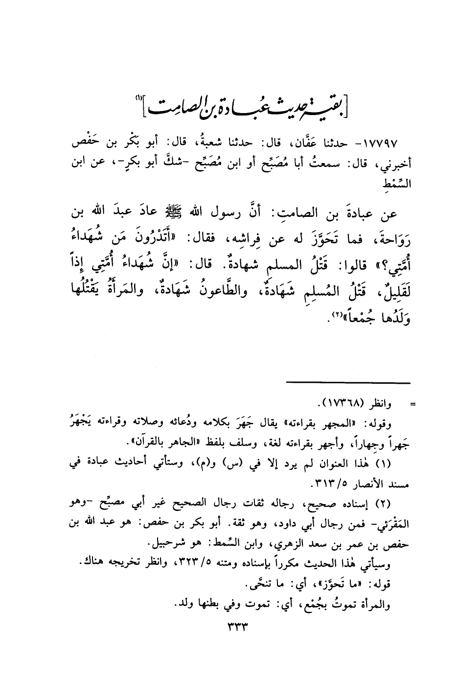 ١٧٧٩٧ - حَدَّثَنَا عَفَّانُ، قَالَ: حَدَّثَنَا شُعْبَةُ، قَالَ: أَبُو بَكْرِ بْنُ حَفْصٍ، أَخْبَرَنِي قَالَ: سَمِعْتُ أَبَا مُصَبِّحٍ، أَوْ ابْنَ مُصَبِّحٍ، - شَكَّ أَبُو بَكْرٍ - عَنِ ابْنِ السِّمْطِ، عَنْ عُبَادَةَ بْنِ الصَّامِتِ: أَنَّ رَسُولَ اللهِ صَلَّى اللهُ عَلَيْهِ وَسَلَّمَ عَادَ عَبْدَ اللهِ بْنَ رَوَاحَةَ، فَمَا تَحَوَّزَ لَهُ عَنْ فِرَاشِهِ، فَقَالَ: " أَتَدْرُونَ مَنْ شُهَدَاءُ أُمَّتِي؟ " قَالُوا: قَتْلُ الْمُسْلِمِ شَهَادَةٌ، قَالَ: " إِنَّ شُهَدَاءَ أُمَّتِي إِذًا لَقَلِيلٌ، قَتْلُ الْمُسْلِمِ شَهَادَةٌ، وَالطَّاعُونُ شَهَادَةٌ، وَالْمَرْأَةُ يَقْتُلُهَا وَلَدُهَا جَمْعَا " (٢)