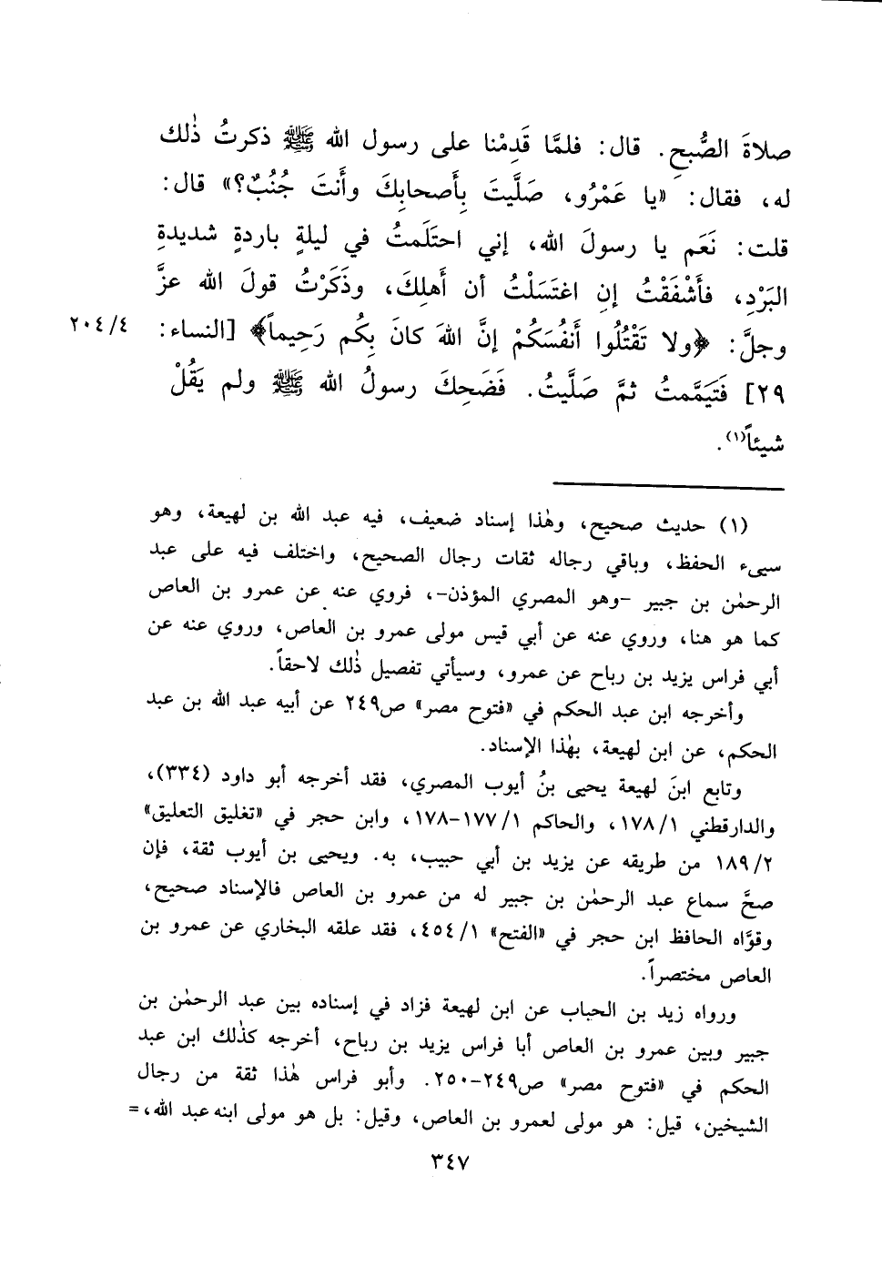 صَلَاةَ الصُّبْحِ، قَالَ: فَلَمَّا قَدِمْنَا عَلَى رَسُولِ اللهِ صَلَّى اللهُ عَلَيْهِ وَسَلَّمَ ذَكَرْتُ ذَلِكَ لَهُ، فَقَالَ: " يَا عَمْرُو، صَلَّيْتَ بِأَصْحَابِكَ وَأَنْتَ جُنُبٌ؟ " قَالَ: قُلْتُ: نَعَمْ يَا رَسُولَ اللهِ، إِنِّي احْتَلَمْتُ فِي لَيْلَةٍ بَارِدَةٍ شَدِيدَةِ الْبَرْدِ، فَأَشْفَقْتُ إِنْ اغْتَسَلْتُ أَنْ أَهْلَكَ، وَذَكَرْتُ قَوْلَ اللهِ عَزَّ وَجَلَّ {وَلَا تَقْتُلُوا أَنْفُسَكُمْ إِنَّ اللهَ كَانَ بِكُمْ رَحِيمًا} [النساء: ٢٩] فَتَيَمَّمْتُ، ثُمَّ صَلَّيْتُ. فَضَحِكَ رَسُولُ اللهِ صَلَّى اللهُ عَلَيْهِ وَسَلَّمَ وَلَمْ يَقُلْ شَيْئًا (١)