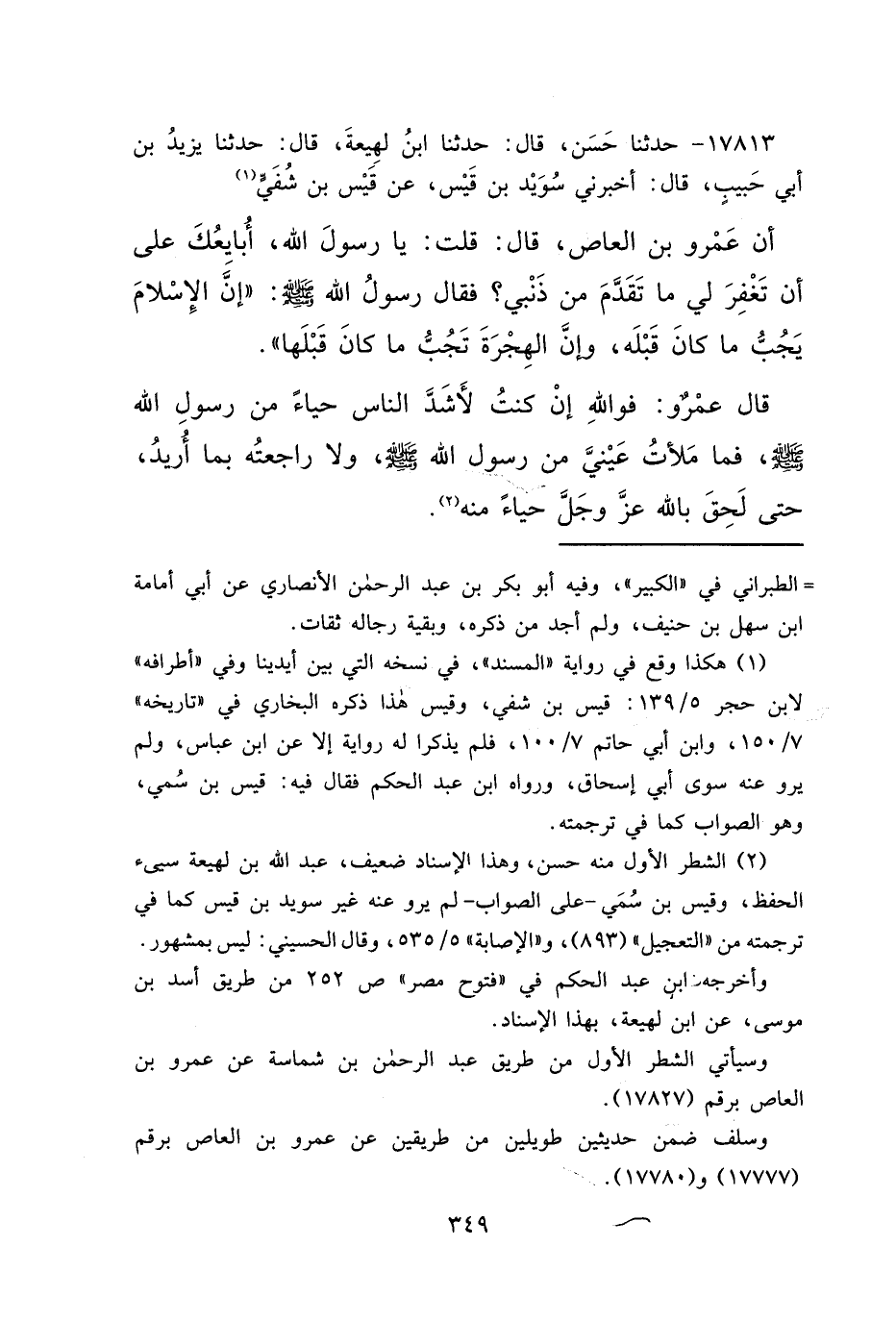 ١٧٨١٣ - حَدَّثَنَا حَسَنٌ، قَالَ: حَدَّثَنَا ابْنُ لَهِيعَةَ، قَالَ: حَدَّثَنَا يَزِيدُ بْنُ أَبِي حَبِيبٍ، قَالَ: أَخْبَرَنِي سُوَيْدُ بْنُ قَيْسٍ، عَنْ قَيْسِ بْنِ شُفَيٍّ (١) ، أَنَّ عَمْرَو بْنَ الْعَاصِ، قَالَ: قُلْتُ: يَا رَسُولَ اللهِ، أُبَايِعُكَ عَلَى أَنْ تَغْفِرَ لِي مَا تَقَدَّمَ مِنْ ذَنْبِي؟ فَقَالَ رَسُولُ اللهِ صَلَّى اللهُ عَلَيْهِ وَسَلَّمَ: " إِنَّ الْإِسْلَامَ يَجُبُّ مَا كَانَ قَبْلَهُ، وَإِنَّ الْهِجْرَةَ تَجُبُّ مَا كَانَ قَبْلَهَا "