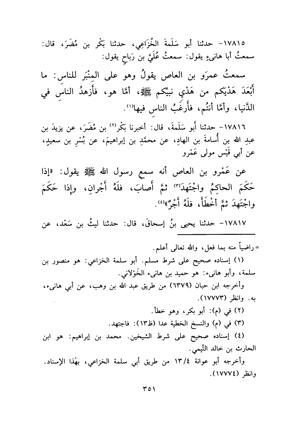 ١٧٨١٦ - حَدَّثَنَا أَبُو سَلَمَةَ، قَالَ: أَخْبَرَنَا بَكْرُ (٢) بْنُ مُضَرَ، عَنْ يَزِيدَ بْنِ عَبْدِ اللهِ بْنِ أُسَامَةَ بْنِ الْهَادِ، عَنْ مُحَمَّدِ بْنِ إِبْرَاهِيمَ، عَنْ بُسْرِ بْنِ سَعِيدٍ، عَنْ أَبِي قَيْسٍ، مَوْلَى عَمْرٍو، عَنْ عَمْرِو بْنِ الْعَاصِ، أَنَّهُ سَمِعَ رَسُولَ اللهِ صَلَّى اللهُ عَلَيْهِ وَسَلَّمَ يَقُولُ: " إِذَا حَكَمَ الْحَاكِمُ وَاجْتَهَدَ (٣) ، ثُمَّ أَصَابَ فَلَهُ أَجْرَانِ، وَإِذَا حَكَمَ وَاجْتَهَدَ ثُمَّ أَخْطَأَ فَلَهُ أَجْرٌ " (٤)