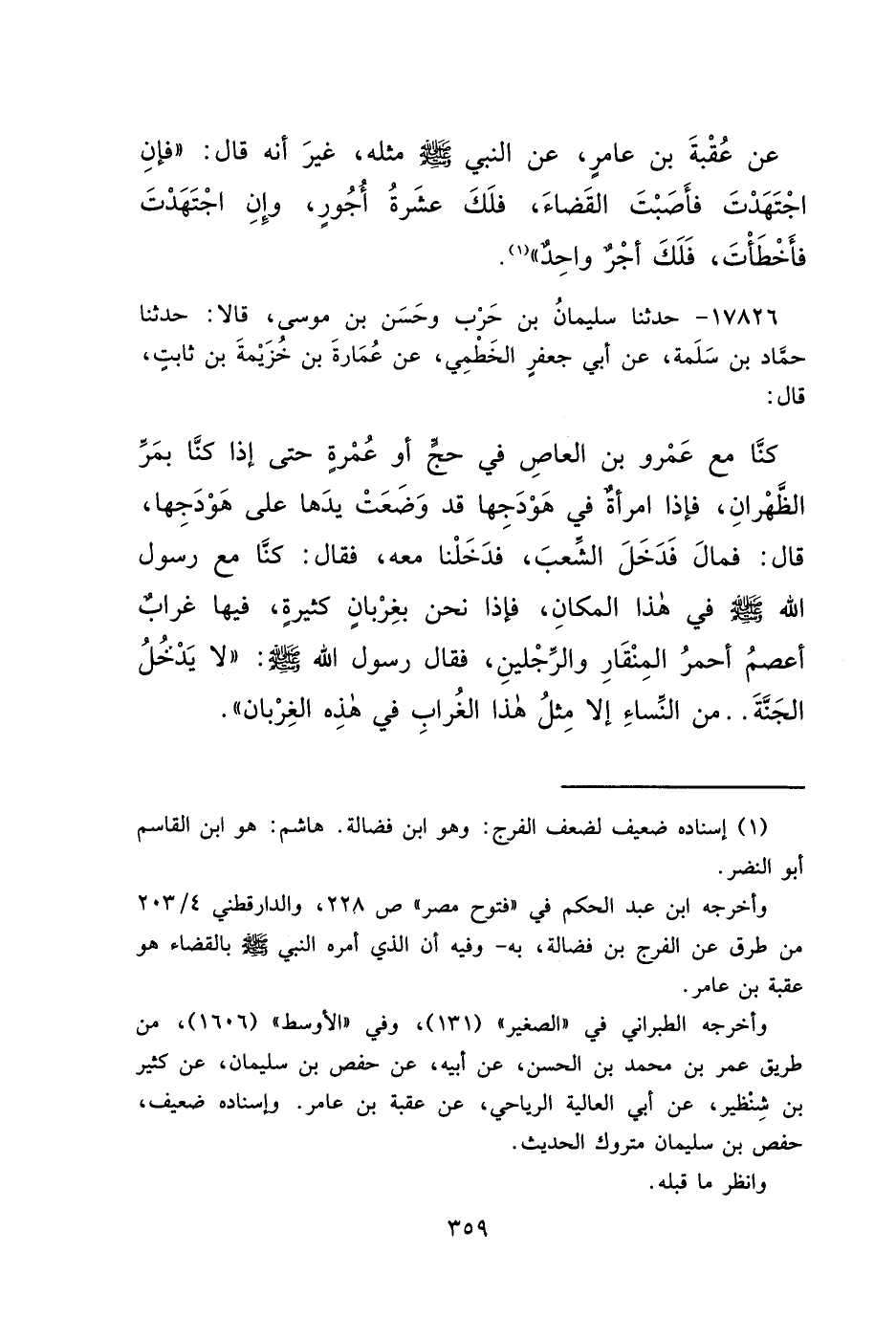 ١٧٨٢٦ - حَدَّثَنَا سُلَيْمَانُ بْنُ حَرْبٍ، وَحَسَنُ بْنُ مُوسَى، قَالَا: حَدَّثَنَا حَمَّادُ بْنُ سَلَمَةَ، عَنْ أَبِي جَعْفَرٍ الْخَطْمِيِّ، عَنْ عُمَارَةَ بْنِ خُزَيْمَةَ بْنِ ثَابِتٍ، قَالَ: كُنَّا مَعَ عَمْرِو بْنِ الْعَاصِ فِي حَجٍّ أَوْ عُمْرَةٍ حَتَّى إِذَا كُنَّا بِمَرِّ الظَّهْرَانِ، فَإِذَا امْرَأَةٌ فِي هَوْدَجِهَا قَدْ وَضَعَتْ يَدَهَا عَلَى هَوْدَجِهَا، قَالَ: فَمَالَ فَدَخَلَ الشِّعْبَ فَدَخَلْنَا مَعَهُ، فَقَالَ: كُنَّا مَعَ رَسُولِ اللهِ صَلَّى اللهُ عَلَيْهِ وَسَلَّمَ فِي هَذَا الْمَكَانِ، فَإِذَا نَحْنُ بِغِرْبَانٍ كَثِيرَةٍ، فِيهَا غُرَابٌ أَعْصَمُ أَحْمَرُ الْمِنْقَارِ وَالرِّجْلَيْنِ، فَقَالَ رَسُولُ اللهِ صَلَّى اللهُ عَلَيْهِ وَسَلَّمَ: " لَا يَدْخُلُ الْجَنَّةَ مِنَ النِّسَاءِ إِلَّا مِثْلُ هَذَا الْغُرَابِ فِي هَذِهِ الْغِرْبَانِ "