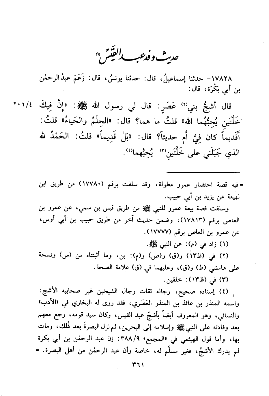١٧٨٢٨ - حَدَّثَنَا إِسْمَاعِيلُ، قَالَ: حَدَّثَنَا يُونُسُ، قَالَ: زَعَمَ عَبْدُ الرَّحْمَنِ بْنُ أَبِي بَكْرَةَ، قَالَ: قَالَ أَشَجُّ بني (٢) عَصَرٍ: قَالَ لِي رَسُولُ اللهِ صَلَّى اللهُ عَلَيْهِ وَسَلَّمَ: " إِنَّ فِيكَ خَلَّتَيْنِ يُحِبُّهُمَا اللهُ "، قُلْتُ: مَا هُمَا؟ قَالَ: " الْحِلْمُ، وَالْحَيَاءُ " قُلْتُ: أَقَدِيمًا كَانَ فِيَّ أَمْ حَدِيثًا؟ قَالَ: " بَلْ قَدِيمًا " قُلْتُ: الْحَمْدُ لِلَّهِ الَّذِي جَبَلَنِي عَلَى خَلَّتَيْنِ (٣) يُحِبُّهُمَا (٤)