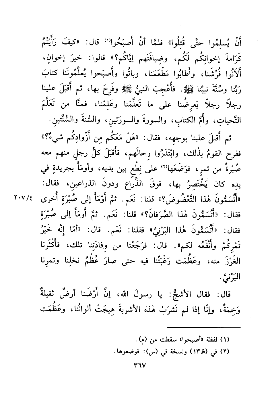 أَنْ يُسْلِمُوا حَتَّى قُتِلُوا "، فَلَمَّا أَنْ أصبَحُوا (١) قَالَ: " كَيْفَ رَأَيْتُمْ كَرَامَةَ إِخْوَانِكُمْ لَكُمْ، وَضِيَافَتَهُمْ إِيَّاكُمْ؟ " قَالُوا: خَيْرَ إِخْوَانٍ، أَلَانُوا فَرْشَنَا، وَأَطَابُوا مَطْعَمَنَا، وَبَاتُوا وَأَصْبَحُوا يُعَلِّمُونَنَا كِتَابَ رَبِّنَا وَسُنَّةَ نَبِيِّنَا، فَأُعْجِبَ النَّبِيُّ صَلَّى اللهُ عَلَيْهِ وَسَلَّمَ، وَفَرِحَ بِهَا، ثُمَّ أَقْبَلَ عَلَيْنَا رَجُلًا رَجُلًا يَعْرِضُنَا عَلَى مَا تَعَلَّمْنَا وَعَلِمْنَا، فَمِنَّا مَنْ تَعَلَّمَ التَّحِيَّاتِ، وَأُمَّ الْكِتَابِ، وَالسُّورَةَ، وَالسُّورَتَيْنِ، وَالسُّنَّةَ، وَالسُّنَّتَيْنِ، ثُمَّ أَقْبَلَ عَلَيْنَا بِوَجْهِهِ، فَقَالَ: " هَلْ مَعَكُمْ مِنْ أَزْوَادِكُمْ شَيْءٌ؟ " فَفَرِحَ الْقَوْمُ بِذَلِكَ، وَابْتَدَرُوا رِحَالَهُمْ، فَأَقْبَلَ كُلُّ رَجُلٍ مَعَهُ صُبْرَةٌ مِنْ تَمْرٍ، فَوَضَعَهَا (٢) عَلَى نِطْعٍ بَيْنَ يَدَيْهِ، وَأَوْمَأَ بِجَرِيدَةٍ فِي يَدِهِ كَانَ يَخْتَصِرُ بِهَا، فَوْقَ الذِّرَاعِ وَدُونَ الذِّرَاعَيْنِ، فَقَالَ: " أَتُسَمُّونَ هَذَا التَّعْضُوضَ؟ " قُلْنَا: نَعَمْ، ثُمَّ أَوْمَأَ إِلَى صُبْرَةٍ أُخْرَى، فَقَالَ: " أَتُسَمُّونَ هَذَا الصَّرَفَانَ؟ "، قُلْنَا: نَعَمْ، ثُمَّ أَوْمَأَ إِلَى صُبْرَةٍ، فَقَالَ: " أَتُسَمُّونَ هَذَا الْبَرْنِيَّ؟ " فَقُلْنَا: نَعَمْ. قَالَ: " أَمَا إِنَّهُ خَيْرُ تَمْرِكُمْ وَأَنْفَعُهُ لَكُمْ "، قَالَ: فَرَجَعْنَا مِنْ وِفَادَتِنَا تِلْكَ، فَأَكْثَرْنَا الْغَرْزَ مِنْهُ، وَعَظُمَتْ رَغْبَتُنَا فِيهِ حَتَّى صَارَ عُظْمَ نَخْلِنَا وَتَمْرِنَا الْبَرْنِيُّ، قَالَ: فَقَالَ الْأَشَجُّ: يَا رَسُولَ اللهِ إِنَّ أَرْضَنَا أَرْضٌ ثَقِيلَةٌ وَخِمَةٌ، وَإِنَّا إِذَا لَمْ نَشْرَبْ هَذِهِ الْأَشْرِبَةَ هِيجَتْ أَلْوَانُنَا، وَعَظُمَتْ