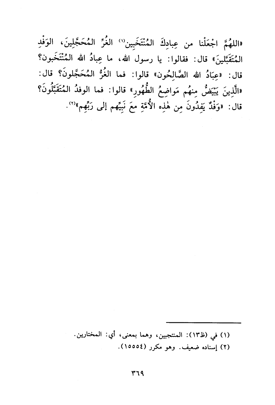 اللهُمَّ اجْعَلْنَا مِنْ عِبَادِكَ الْمُنْتَخَبِينَ (١) ، الْغُرِّ الْمُحَجَّلِينَ، الْوَفْدِ الْمُتَقَبَّلِينَ " قَالَ: فَقَالُوا: يَا رَسُولَ اللهِ، مَا عِبَادُ اللهِ الْمُنْتَخَبُونَ؟ قَالَ: " عِبَادُ اللهِ الصَّالِحُونَ " قَالُوا: فَمَا الْغُرُّ الْمُحَجَّلُونَ؟ قَالَ: " الَّذِينَ يَبْيَضُّ مِنْهُمْ مَوَاضِعُ الطُّهُورِ " قَالُوا: فَمَا الْوَفْدُ الْمُتَقَبَّلُونَ؟ قَالَ: " وَفْدٌ يَفِدُونَ مِنْ هَذِهِ الْأُمَّةِ مَعَ نَبِيِّهِمْ إِلَى رَبِّهِم " (٢)