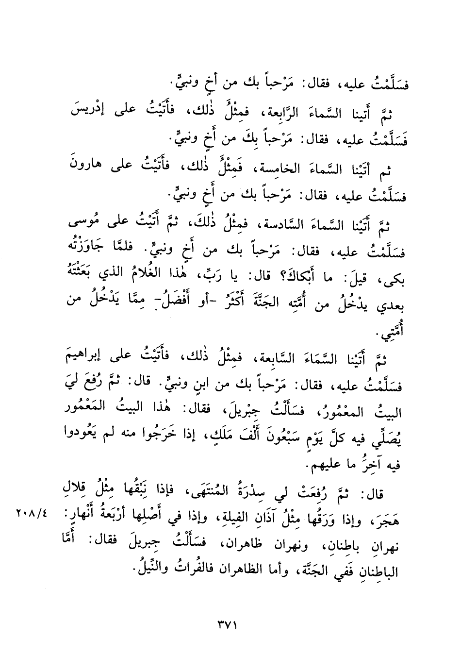فَسَلَّمْتُ عَلَيْهِ، فَقَالَ: مَرْحَبًا بِكَ مِنْ أَخٍ وَنَبِيٍّ، ثُمَّ أَتَيْنَا السَّمَاءَ الرَّابِعَةَ، فَمِثْلُ ذَلِكَ، فَأَتَيْتُ عَلَى إِدْرِيسَ، فَسَلَّمْتُ عَلَيْهِ، فَقَالَ: مَرْحَبًا بِكَ مِنْ أَخٍ وَنَبِيٍّ، ثُمَّ أَتَيْنَا السَّمَاءَ الْخَامِسَةَ، فَمِثْلُ ذَلِكَ، فَأَتَيْتُ عَلَى هَارُونَ فَسَلَّمْتُ عَلَيْهِ، فَقَالَ: مَرْحَبًا بِكَ مِنْ أَخٍ وَنَبِيٍّ، ثُمَّ أَتَيْنَا السَّمَاءَ السَّادِسَةَ، فَمِثْلُ ذَلِكَ، ثُمَّ أَتَيْتُ عَلَى مُوسَى فَسَلَّمْتُ عَلَيْهِ، فَقَالَ: مَرْحَبًا بِكَ مِنْ أَخٍ وَنَبِيٍّ، فَلَمَّا جَاوَزْتُهُ بَكَى، قِيلَ: مَا أَبْكَاكَ؟ قَالَ: يَا رَبِّ هَذَا الْغُلَامُ الَّذِي بَعَثْتَهُ بَعْدِي يَدْخُلُ مِنْ أُمَّتِهِ الْجَنَّةَ أَكْثَرُ وَأَفْضَلُ مِمَّا يَدْخُلُ مِنْ أُمَّتِي، ثُمَّ أَتَيْنَا السَّمَاءَ السَّابِعَةَ، فَمِثْلُ ذَلِكَ فَأَتَيْتُ عَلَى إِبْرَاهِيمَ فَسَلَّمْتُ عَلَيْهِ، فَقَالَ: مَرْحَبًا بِكَ مِنْ ابْنٍ وَنَبِيٍّ، قَالَ: ثُمَّ رُفِعَ لِيَ الْبَيْتُ الْمَعْمُورُ، فَسَأَلْتُ جِبْرِيلَ، فَقَالَ هَذَا الْبَيْتُ الْمَعْمُورُ يُصَلِّي فِيهِ كُلَّ يَوْمٍ سَبْعُونَ أَلْفَ مَلَكٍ، إِذَا خَرَجُوا مِنْهُ لَمْ يَعُودُوا فِيهِ آخِرَ مَا عَلَيْهِمْ، قَالَ: ثُمَّ رُفِعَتْ إِلَيَّ سِدْرَةُ الْمُنْتَهَى، فَإِذَا نَبْقُهَا مِثْلُ قِلَالِ هَجَرَ، وَإِذَا وَرَقُهَا مِثْلُ آذَانِ الْفِيَلَةِ، وَإِذَا فِي أَصْلِهَا أَرْبَعَةُ أَنْهَارٍ: نَهَرَانِ بَاطِنَانِ، وَنَهَرَانِ ظَاهِرَانِ، فَسَأَلْتُ جِبْرِيلَ فَقَالَ: أَمَّا الْبَاطِنَانِ فَفِي الْجَنَّةِ، وَأَمَّا الظَّاهِرَانِ فَالْفُرَاتُ، وَالنِّيلُ،