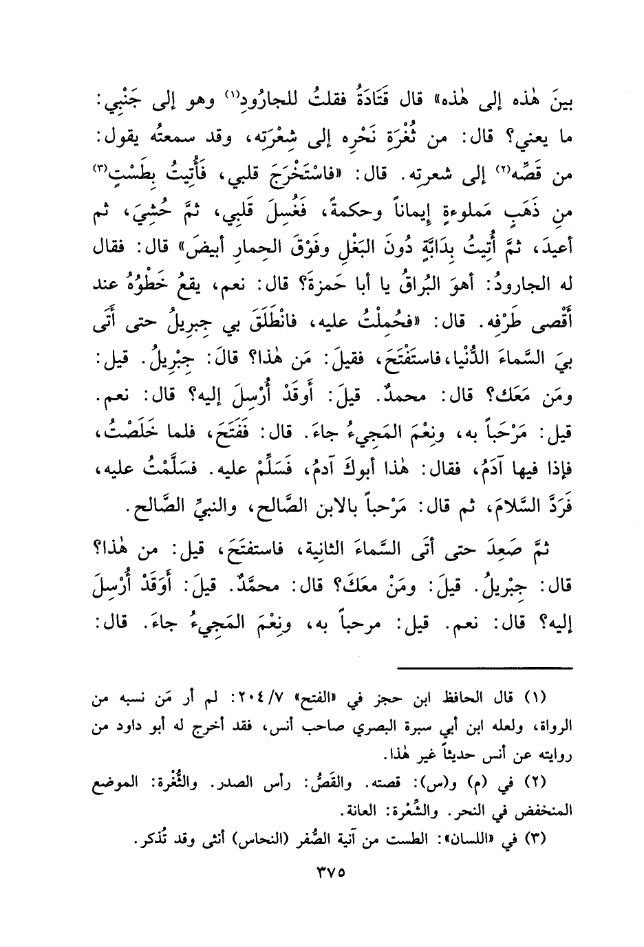 بَيْنَ هَذِهِ إِلَى هَذِهِ "، قَالَ قَتَادَةُ: فَقُلْتُ لِلْجَارُودِ (١) ، وَهُوَ إِلَى جَنْبِي مَا يَعْنِي، قَالَ: " مِنْ ثُغْرَةِ نَحْرِهِ إِلَى شِعْرَتِهِ، وَقَدْ سَمِعْتُهُ يَقُولُ: مِنْ قَصَّهِ (٢) إِلَى شِعْرَتِهِ " قَالَ: " فَاسْتُخْرِجَ قَلْبِي فَأُتِيتُ بِطَسْتٍ (٣) مِنْ ذَهَبٍ مَمْلُوءَةٍ إِيمَانًا وَحِكْمَةً، فَغُسِلَ قَلْبِي، ثُمَّ حُشِيَ، ثُمَّ أُعِيدَ، ثُمَّ أُتِيتُ بِدَابَّةٍ دُونَ الْبَغْلِ وَفَوْقَ الْحِمَارِ أَبْيَضَ " قَالَ: فَقَالَ الْجَارُودُ: هُوَ الْبُرَاقُ يَا أَبَا حَمْزَةَ؟ قَالَ: " نَعَمْ يَقَعُ خَطْوُهُ عِنْدَ أَقْصَى طَرْفِهِ "، قَالَ: " فَحُمِلْتُ عَلَيْهِ، فَانْطَلَقَ بِي جِبْرِيلُ حَتَّى أَتَى بِيَ السَّمَاءَ الدُّنْيَا، فَاسْتَفْتَحَ، فَقِيلَ: مَنْ هَذَا؟ قَالَ: جِبْرِيلُ، قِيلَ: وَمَنْ مَعَكَ؟ قَالَ: مُحَمَّدٌ، قِيلَ: أَوَقَدْ أُرْسِلَ إِلَيْهِ؟ قَالَ: نَعَمْ، قِيلَ: مَرْحَبًا بِهِ، وَنِعْمَ الْمَجِيءُ جَاءَ، قَالَ: فَفُتِحَ، فَلَمَّا خَلَصْتُ، فَإِذَا فِيهَا آدَمُ، فَقَالَ: هَذَا أَبُوكَ آدَمُ، فَسَلِّمْ عَلَيْهِ، فَسَلَّمْتُ عَلَيْهِ، فَرَدَّ السَّلَامَ، ثُمَّ قَالَ: مَرْحَبًا بِالِابْنِ الصَّالِحِ، وَالنَّبِيِّ الصَّالِحِ،