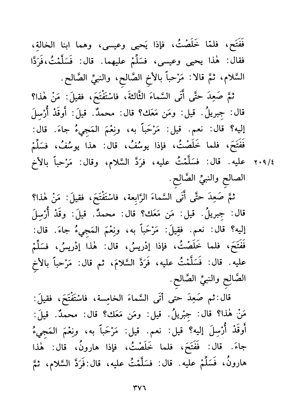 فَفُتِحَ، فَلَمَّا خَلَصْتُ، فَإِذَا يَحْيَى وَعِيسَى، وَهُمَا ابْنَا الْخَالَةِ، فَقَالَ: هَذَا يَحْيَى وَعِيسَى، فَسَلِّمْ عَلَيْهِمَا، قَالَ: فَسَلَّمْتُ، فَرَدَّا السَّلَامَ، ثُمَّ قَالَا: مَرْحَبًا بِالْأَخِ الصَّالِحِ وَالنَّبِيِّ الصَّالِحِ، قَالَ: ثُمَّ صَعِدَ حَتَّى أَتَى السَّمَاءَ الثَّالِثَةَ، فَاسْتَفْتَحَ فَقِيلَ: مَنْ هَذَا؟ قَالَ: جِبْرِيلُ، قِيلَ: وَمَنْ مَعَكَ؟ قَالَ: مُحَمَّدٌ قِيلَ: أَوَقَدْ أُرْسِلَ إِلَيْهِ؟ قَالَ: نَعَمْ، قِيلَ: مَرْحَبًا بِهِ، وَنِعْمَ الْمَجِيءُ جَاءَ، قَالَ: فَفُتِحَ فَلَمَّا خَلَصْتُ، فَإِذَا يُوسُفُ، قَالَ: هَذَا يُوسُفُ، فَسَلِّمْ عَلَيْهِ، قَالَ: فَسَلَّمْتُ عَلَيْهِ فَرَدَّ السَّلَامَ، وَقَالَ: مَرْحَبًا بِالْأَخِ الصَّالِحِ، وَالنَّبِيِّ الصَّالِحِ، ثُمَّ صَعِدَ حَتَّى أَتَى السَّمَاءَ الرَّابِعَةَ، فَاسْتَفْتَحَ، فَقِيلَ: مَنْ هَذَا؟ قَالَ: جِبْرِيلُ، قِيلَ: مَنْ مَعَكَ؟ قَالَ: مُحَمَّدٌ، قِيلَ: وَقَدْ أُرْسِلَ إِلَيْهِ؟، قَالَ: نَعَمْ، قِيلَ: مَرْحَبًا بِهِ، وَنِعْمَ الْمَجِيءُ، جَاءَ، قَالَ: فَفُتِحَ، فَلَمَّا خَلَصْتُ، فَإِذَا إِدْرِيسُ، قَالَ: هَذَا إِدْرِيسُ فَسَلِّمْ عَلَيْهِ، قَالَ: فَسَلَّمْتُ عَلَيْهِ فَرَدَّ السَّلَامَ، ثُمَّ قَالَ: مَرْحَبًا بِالْأَخِ الصَّالِحِ، وَالنَّبِيِّ الصَّالِحِ، قَالَ: ثُمَّ صَعِدَ حَتَّى أَتَى السَّمَاءَ الْخَامِسَةَ، فَاسْتَفْتَحَ، فَقِيلَ: مَنْ هَذَا؟ قَالَ: جِبْرِيلُ قِيلَ: وَمَنْ مَعَكَ؟ قَالَ: مُحَمَّدٌ، قِيلَ: أَوَقَدْ أُرْسِلَ إِلَيْهِ؟ قَالَ: نَعَمْ، قِيلَ: مَرْحَبًا بِهِ، وَنِعْمَ الْمَجِيءُ جَاءَ، قَالَ: فَفُتِحَ فَلَمَّا خَلَصْتُ، فَإِذَا هَارُونُ، قَالَ: هَذَا هَارُونُ، فَسَلِّمْ عَلَيْهِ، قَالَ: فَسَلَّمْتُ عَلَيْهِ، قَالَ: فَرَدَّ السَّلَامَ، ثُمَّ