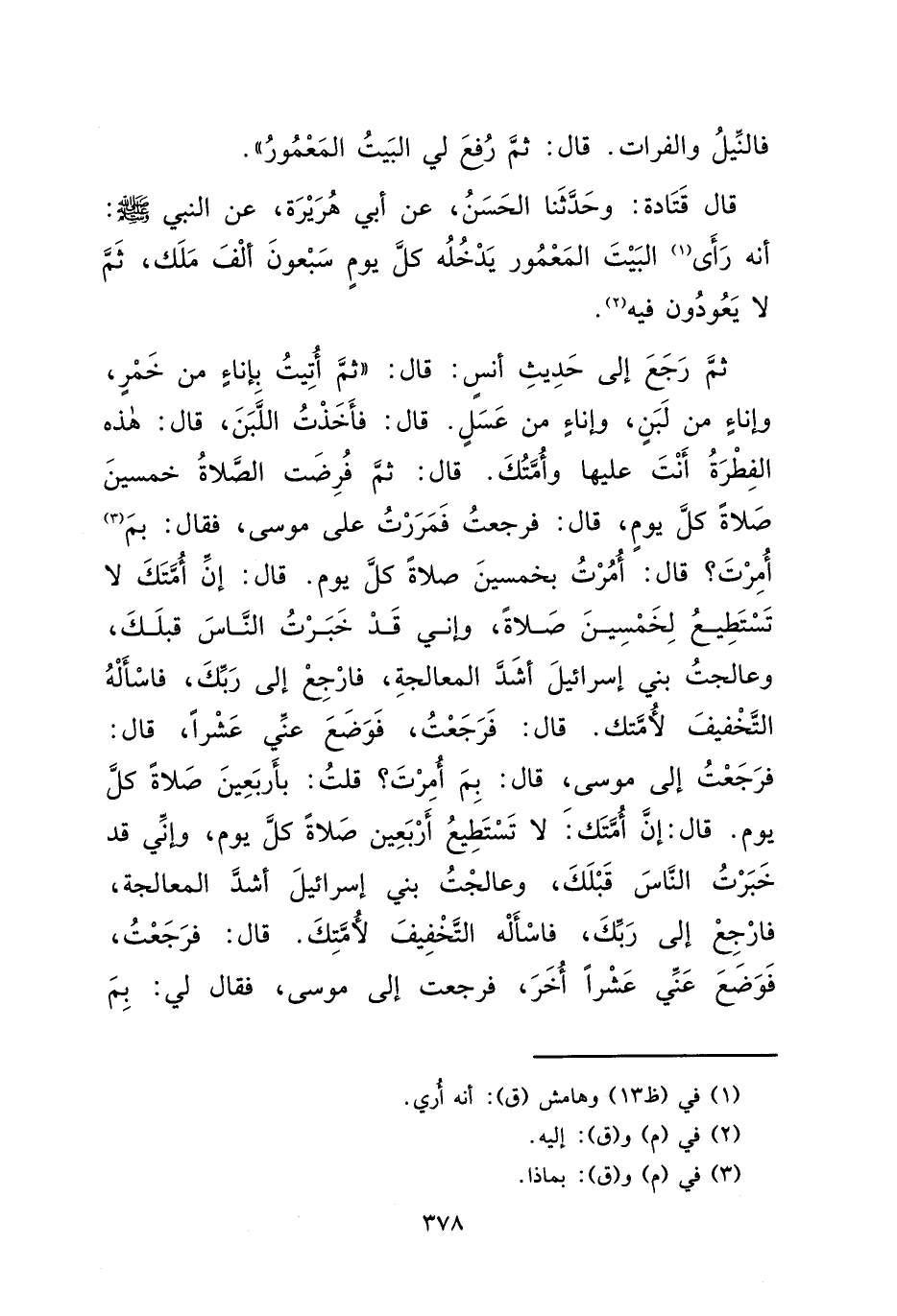 قَالَ قَتَادَةُ: وَحَدَّثَنَا الْحَسَنُ، عَنْ أَبِي هُرَيْرَةَ، عَنِ النَّبِيِّ صَلَّى اللهُ عَلَيْهِ وَسَلَّمَ أَنَّهُ رَأَى (١) الْبَيْتَ الْمَعْمُورَ يَدْخُلُهُ كُلَّ يَوْمٍ سَبْعُونَ أَلْفَ مَلَكٍ، ثُمَّ لَا يَعُودُونَ فِيهِ (٢) ، ثُمَّ رَجَعَ إِلَى حَدِيثِ أَنَسٍ قَالَ: ثُمَّ أُتِيتُ بِإِنَاءٍ مِنْ خَمْرٍ، وَإِنَاءٍ مِنْ لَبَنٍ، وَإِنَاءٍ مِنْ عَسَلٍ، قَالَ: فَأَخَذْتُ اللَّبَنَ، قَالَ: " هَذِهِ الْفِطْرَةُ أَنْتَ عَلَيْهَا وَأُمَّتُكَ "، قَالَ: " ثُمَّ فُرِضَتِ الصَّلَاةُ خَمْسِينَ صَلَاةً كُلَّ يَوْمٍ، قَالَ: فَرَجَعْتُ فَمَرَرْتُ عَلَى مُوسَى، فَقَالَ: بِمَ (٣) أُمِرْتَ؟ قَالَ: أُمِرْتُ بِخَمْسِينَ صَلَاةً كُلَّ يَوْمٍ، قَالَ: إِنَّ أُمَّتَكَ لَا تَسْتَطِيعُ لِخَمْسِينَ صَلَاةً، وَإِنِّي قَدْ خَبَرْتُ النَّاسَ قَبْلَكَ وَعَالَجْتُ بَنِي إِسْرَائِيلَ أَشَدَّ الْمُعَالَجَةِ، فَارْجِعْ إِلَى رَبِّكَ، فَاسْأَلْهُ التَّخْفِيفَ لِأُمَّتِكَ، قَالَ: فَرَجَعْتُ، فَوَضَعَ عَنِّي عَشْرًا، قَالَ: فَرَجَعْتُ إِلَى مُوسَى، فَقَالَ: بِمَا أُمِرْتَ؟، قُلْتُ: بِأَرْبَعِينَ صَلَاةً كُلَّ يَوْمٍ، قَالَ: إِنَّ أُمَّتَكَ لَا تَسْتَطِيعُ أَرْبَعِينَ صَلَاةً كُلَّ يَوْمٍ، وَإِنِّي قَدْ خَبَرْتُ النَّاسَ قَبْلَكَ، وَعَالَجْتُ بَنِي إِسْرَائِيلَ أَشَدَّ الْمُعَالَجَةِ، فَارْجِعْ إِلَى رَبِّكَ، فَاسْأَلْهُ التَّخْفِيفَ لِأُمَّتِكَ، قَالَ: فَرَجَعْتُ، فَوَضَعَ عَنِّي عَشْرًا أُخْرَى، فَرَجَعْتُ إِلَى مُوسَى، فَقَالَ لِي: بِمَ