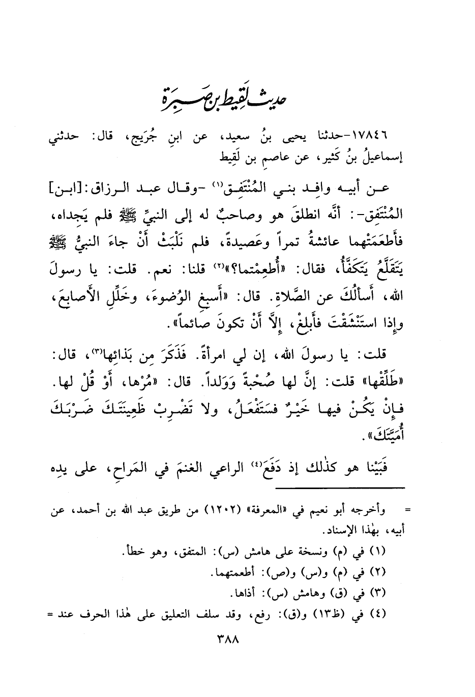 ١٧٨٤٦ - حَدَّثَنَا يَحْيَى بْنُ سَعِيدٍ، عَنِ ابْنِ جُرَيْجٍ، قَالَ: حَدَّثَنِي إِسْمَاعِيلُ بْنُ كَثِيرٍ، عَنْ عَاصِمِ بْنِ لَقِيطٍ، عَنْ أَبِيهِ وَافِدِ بَنِي الْمُنْتَفِقِ (١) ، وَقَالَ: عَبْدُ الرَّزَّاقِ: ابْنِ الْمُنْتَفِقِ، أَنَّهُ انْطَلَقَ هُوَ وَصَاحِبٌ لَهُ إِلَى النَّبِيِّ صَلَّى اللهُ عَلَيْهِ وَسَلَّمَ، فَلَمْ يَجِدَاهُ فَأَطْعَمَتْهُمَا عَائِشَةُ تَمْرًا، وَعَصِيدَةً، فَلَمْ نَلْبَثْ أَنْ جَاءَ النَّبِيُّ صَلَّى اللهُ عَلَيْهِ وَسَلَّمَ يَتَقَلَّعُ يَتَكَفَّأُ، فَقَالَ: " أَطْعَمْتِهِمَا؟ (٢) " قُلْنَا: نَعَمْ قُلْتُ: يَا رَسُولَ اللهِ، أَسْأَلُكَ عَنِ الصَّلَاةِ؟ قَالَ: " أَسْبِغِ الْوُضُوءَ، وَخَلِّلِ الْأَصَابِعَ، وَإِذَا اسْتَنْشَقْتَ فَأَبْلِغْ، إِلَّا أَنْ تَكُونَ صَائِمًا "