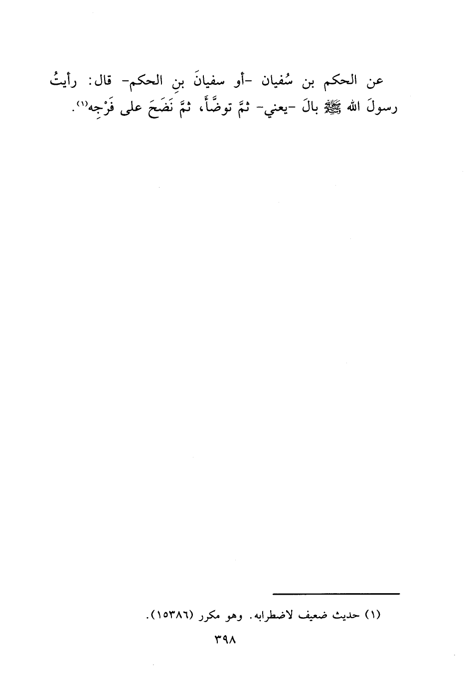 عَنِ الْحَكَمِ بْنِ سُفْيَانَ أَوْ سُفْيَانَ بْنِ الْحَكَمِ، قَالَ: " رَأَيْتُ رَسُولَ اللهِ صَلَّى اللهُ عَلَيْهِ وَسَلَّمَ بَالَ - يَعْنِي - ثُمَّ تَوَضَّأَ، ثُمَّ نَضَحَ عَلَى فَرْجِهِ " (١)