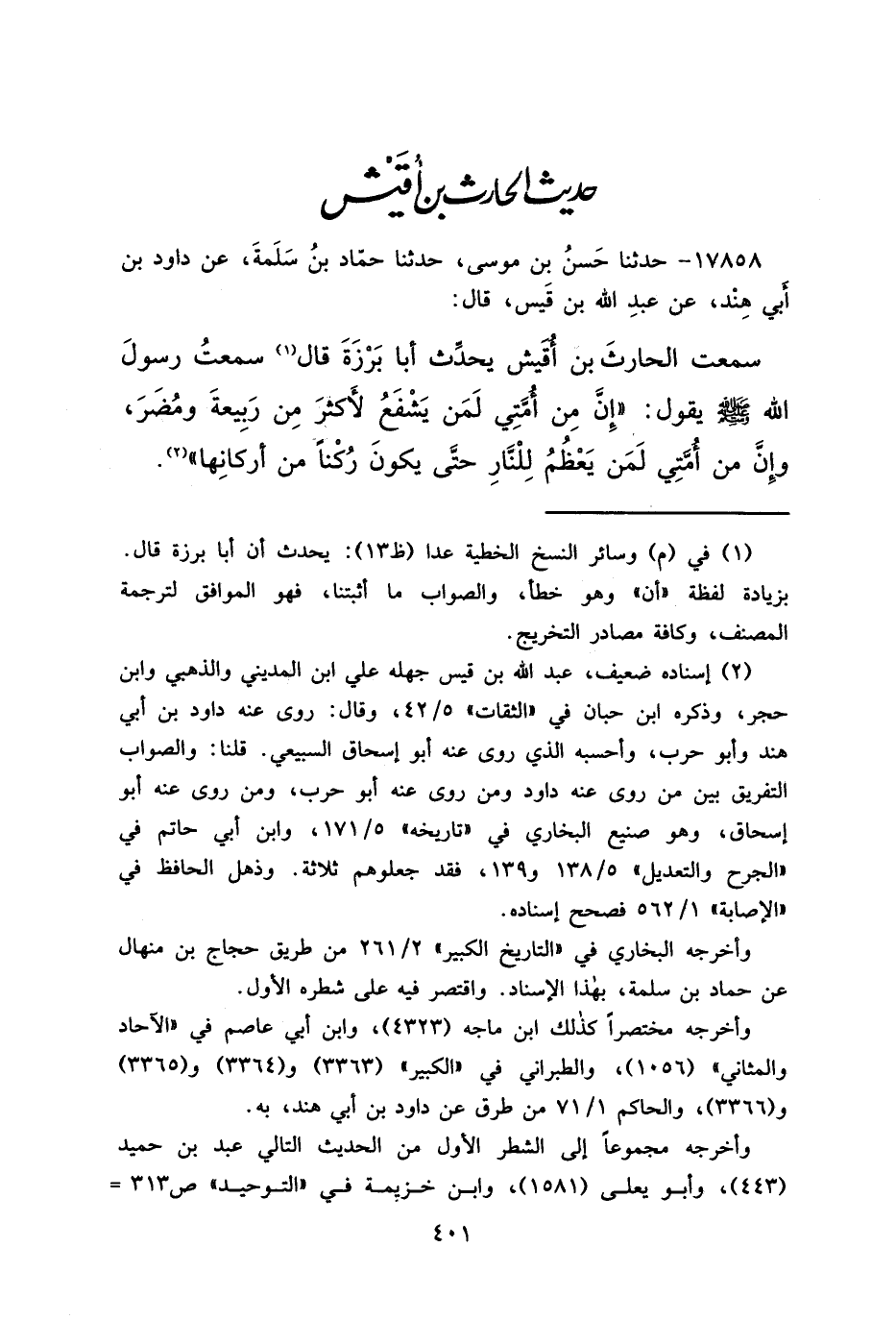 ١٧٨٥٨ - حَدَّثَنَا حَسَنُ بْنُ مُوسَى، حَدَّثَنَا حَمَّادُ بْنُ سَلَمَةَ، عَنْ دَاوُدَ بْنِ أَبِي هِنْدٍ، عَنْ عَبْدِ اللهِ بْنِ قَيْسٍ، قَالَ: سَمِعْتُ الْحَارِثَ بْنَ أُقَيْشٍ، يُحَدِّثُ أَنَّ أَبَا بَرْزَةَ، قَالَ (١) : سَمِعْتُ رَسُولَ اللهِ صَلَّى اللهُ عَلَيْهِ وَسَلَّمَ يَقُولُ: " إِنَّ مِنْ أُمَّتِي لَمَنْ يَشْفَعُ لِأَكْثَرَ مِنْ رَبِيعَةَ، وَمُضَرَ، وَإِنَّ مِنْ أُمَّتِي لَمَنْ يَعْظُمُ لِلنَّارِ حَتَّى يَكُونَ رُكْنًا مِنْ أَرْكَانِهَا " (٢)