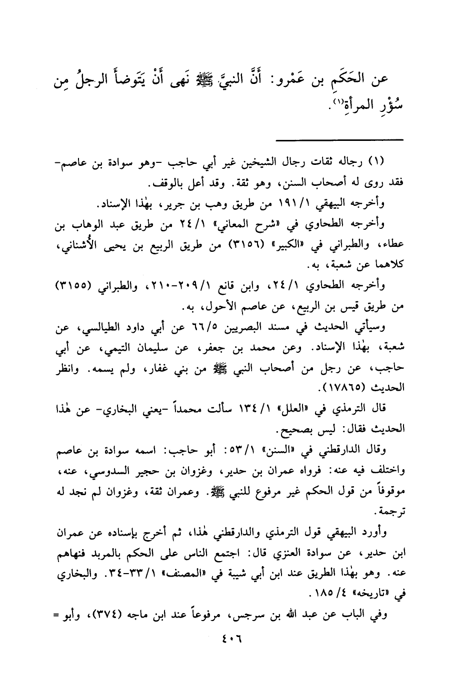وقال الدارقطني في "السنن" ١/٥٣: أبو حاجب: اسمه سوادة بن عاصم واختلف فيه عنه: فرواه عمران بن حدير، وغزوان بن حجير السدوسي، عنه، موقوفاً من قول الحكم غير مرفوع للنبي صَلَّى اللهُ عَلَيْهِ وَسَلَّمَ. وعمران ثقة، وغزوان لم نجد له ترجمة.