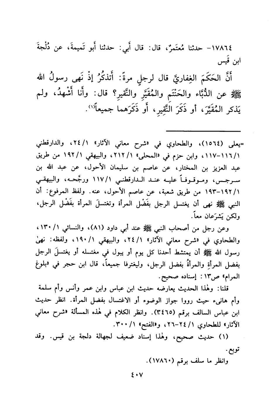 ١٧٨٦٤ - حَدَّثَنَا مُعْتَمِرٌ، قَالَ: قَالَ: أَبِي، حَدَّثَنَا أَبُو تَمِيمَةَ، عَنْ دُلَجَةَ بْنِ قَيْسٍ، أَنَّ الْحَكَمَ الْغِفَارِيَّ، قَالَ لِرَجُلٍ مَرَّةً: " أَتَذْكُرُ إِذْ نَهَى رَسُولُ اللهِ صَلَّى اللهُ عَلَيْهِ وَسَلَّمَ عَنِ الدُّبَّاءِ، وَالْحَنْتَمِ، وَالْمُقَيَّرِ، وَالنَّقِيرِ " قَالَ: وَأَنَا أَشْهَدُ وَلَمْ يَذْكُرِ الْمُقَيَّرَ، أَوْ ذَكَرَ النَّقِيرَ أَوْ ذَكَرَهُمَا جَمِيعًا (١)
