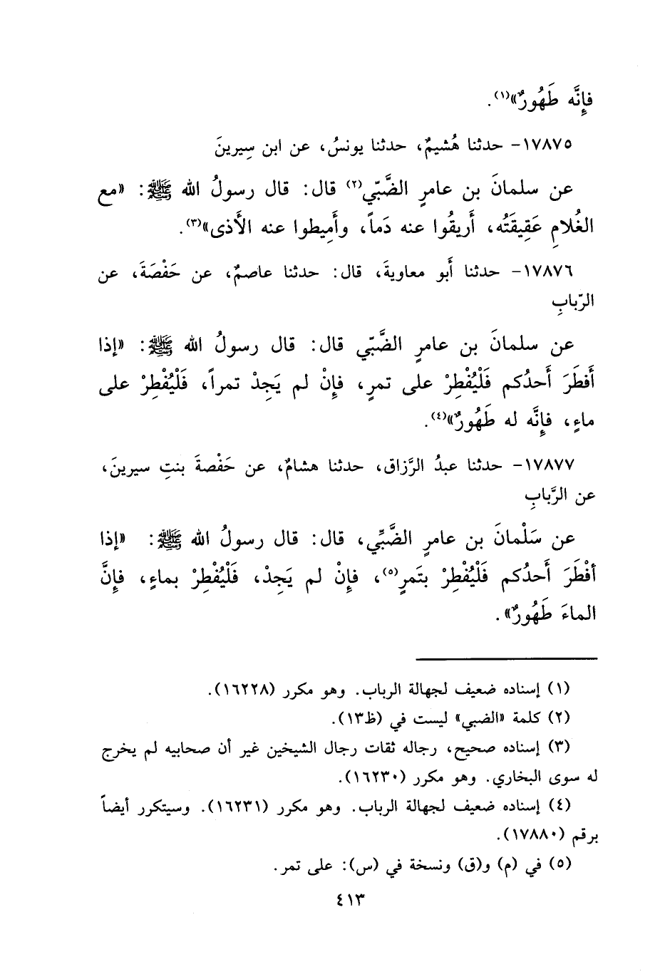 ١٧٨٧٧ - حَدَّثَنَا عَبْدُ الرَّزَّاقِ، حَدَّثَنَا هِشَامٌ، عَنْ حَفْصَةَ بِنْتِ سِيرِينَ، عَنِ الرَّبَابِ، عَنْ سَلْمَانَ بْنِ عَامِرٍ الضَّبِّيِّ، قَالَ: قَالَ رَسُولُ اللهِ صَلَّى اللهُ عَلَيْهِ وَسَلَّمَ: " إِذَا أَفْطَرَ أَحَدُكُمْ فَلْيُفْطِرْ بِتَمْرٍ (٥) ، فَإِنْ لَمْ يَجِدْ فَلْيُفْطِرْ بِمَاءٍ، فَإِنَّ الْمَاءَ طَهُورٌ "