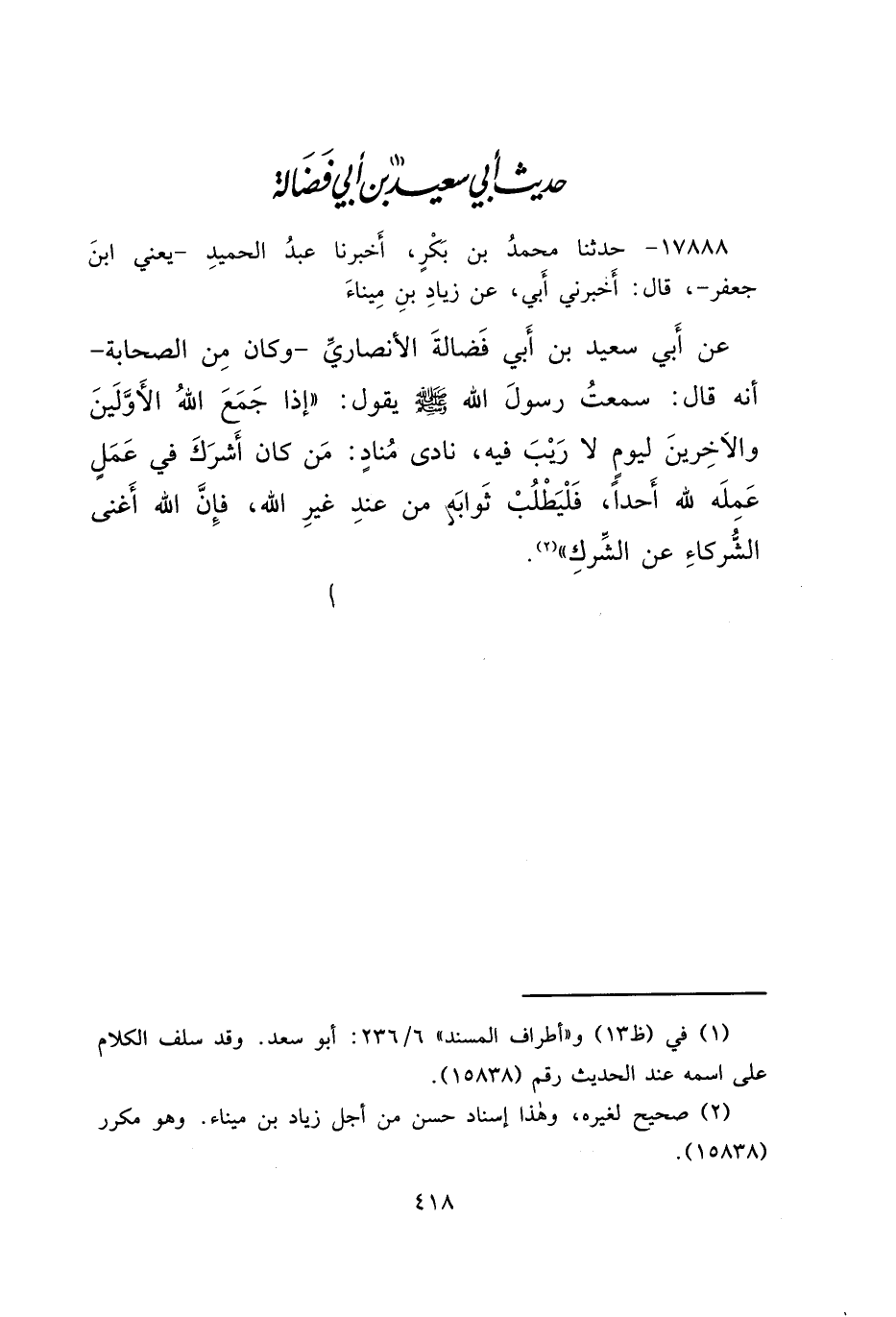 ١٧٨٨٨ - حَدَّثَنَا مُحَمَّدُ بْنُ بَكْرٍ، أَخْبَرَنَا عَبْدُ الْحَمِيدِ يَعْنِي ابْنَ جَعْفَرٍ قَالَ: أَخْبَرَنِي أَبِي، عَنْ زِيَادِ بْنِ مِينَاءَ، عَنْ أَبِي سَعِيدِ بْنِ أَبِي فَضَالَةَ الْأَنْصَارِيِّ، - وَكَانَ مِنَ الصَّحَابَةِ - أَنَّهُ قَالَ: سَمِعْتُ رَسُولَ اللهِ صَلَّى اللهُ عَلَيْهِ وَسَلَّمَ يَقُولُ: " إِذَا جَمَعَ اللهُ الْأَوَّلِينَ وَالْآخِرِينَ، لِيَوْمٍ لَا رَيْبَ فِيهِ، نَادَى مُنَادٍ: مَنْ كَانَ أَشْرَكَ فِي عَمَلٍ عَمِلَهُ لِلَّهِ أَحَدًا، فَلْيَطْلُبْ ثَوَابَهُ مِنْ عِنْدِ غَيْرِ اللهِ، فَإِنَّ اللهَ أَغْنَى الشُّرَكَاءِ عَنِ الشِّرْكِ " (٢)