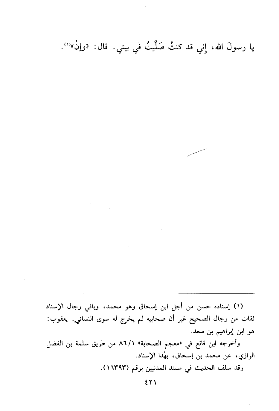 يَا رَسُولَ اللهِ، إِنِّي قَدْ كُنْتُ صَلَّيْتُ فِي بَيْتِي، قَالَ: " وَإِنْ " (١)