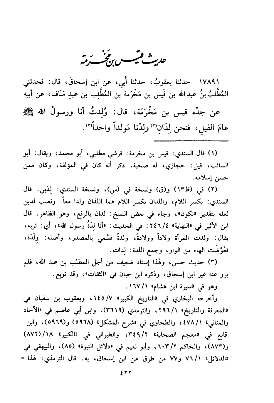 ١٧٨٩١ - حَدَّثَنَا يَعْقُوبُ، حَدَّثَنَا أَبِي، عَنْ ابْنِ إِسْحَاقَ، قَالَ: فَحَدَّثَنِي الْمُطَّلِبُ بْنُ عَبْدِ اللهِ بْنِ قَيْسِ بْنِ مَخْرَمَةَ بْنِ الْمُطَّلِبِ بْنِ عَبْدِ مَنَافٍ، عَنْ أَبِيهِ، عَنْ جَدِّهِ قَيْسِ بْنِ مَخْرَمَةَ، قَالَ: " وُلِدْتُ أَنَا وَرَسُولُ اللهِ صَلَّى اللهُ عَلَيْهِ وَسَلَّمَ عَامَ الْفِيلِ، فَنَحْنُ لِدَانِ (٢) ، وُلِدْنَا مَوْلِدًا وَاحِدًا " (٣)