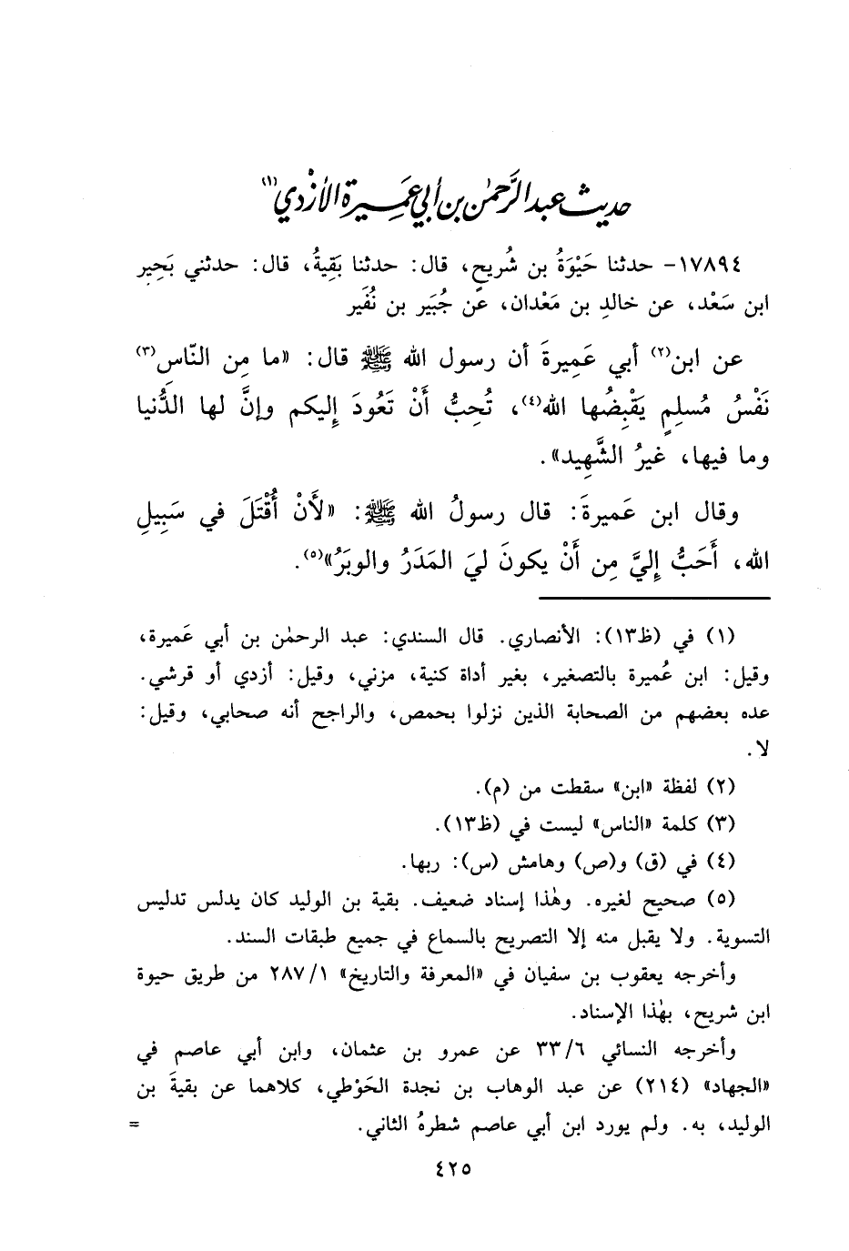١٧٨٩٤ - حَدَّثَنَا حَيْوَةُ بْنُ شُرَيْحٍ، قَالَ: حَدَّثَنَا بَقِيَّةُ، قَالَ: حَدَّثَنِي بَحِيرُ بْنُ سَعْدٍ، عَنْ خَالِدِ بْنِ مَعْدَانَ، عَنْ جُبَيْرِ بْنِ نُفَيْرٍ، عَنِ ابْنِ (٢) أَبِي عَمِيرَةَ، أَنَّ رَسُولَ اللهِ صَلَّى اللهُ عَلَيْهِ وَسَلَّمَ قَالَ: " مَا مِنَ النَّاسِ (٣) نَفْسُ مُسْلِمٍ يَقْبِضُهَا اللهُ (٤) تُحِبُّ أَنْ تَعُودَ إِلَيْكُمْ، وَأَنَّ لَهَا الدُّنْيَا وَمَا فِيهَا، غَيْرُ الشَّهِيدِ "