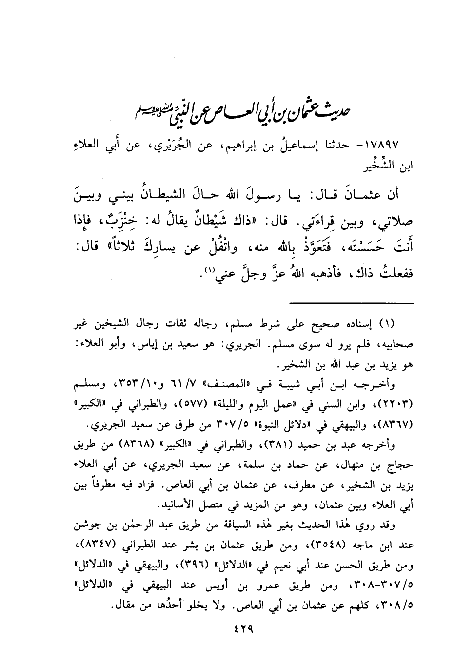 ١٧٨٩٧ - حَدَّثَنَا إِسْمَاعِيلُ بْنُ إِبْرَاهِيمَ، عَنِ الْجُرَيْرِيِّ، عَنْ أَبِي الْعَلَاءِ بْنِ الشِّخِّيرِ، أَنَّ عُثْمَانَ قَالَ: يَا رَسُولَ اللهِ حَالَ الشَّيْطَانُ بَيْنِي وَبَيْنَ صَلَاتِي، وَبَيْنَ قِرَاءَتِي، قَالَ: " ذَاكَ شَيْطَانٌ يُقَالُ لَهُ: خَنْزَبٌ، فَإِذَا أَنْتَ حَسَسْتَهُ، فَتَعَوَّذْ بِاللهِ مِنْهُ، وَاتْفُلْ عَنْ يَسَارِكَ ثَلَاثًا "، قَالَ: فَفَعَلْتُ ذَاكَ، فَأَذْهَبَهُ اللهُ عَزَّ وَجَلَّ عَنِّي (١)