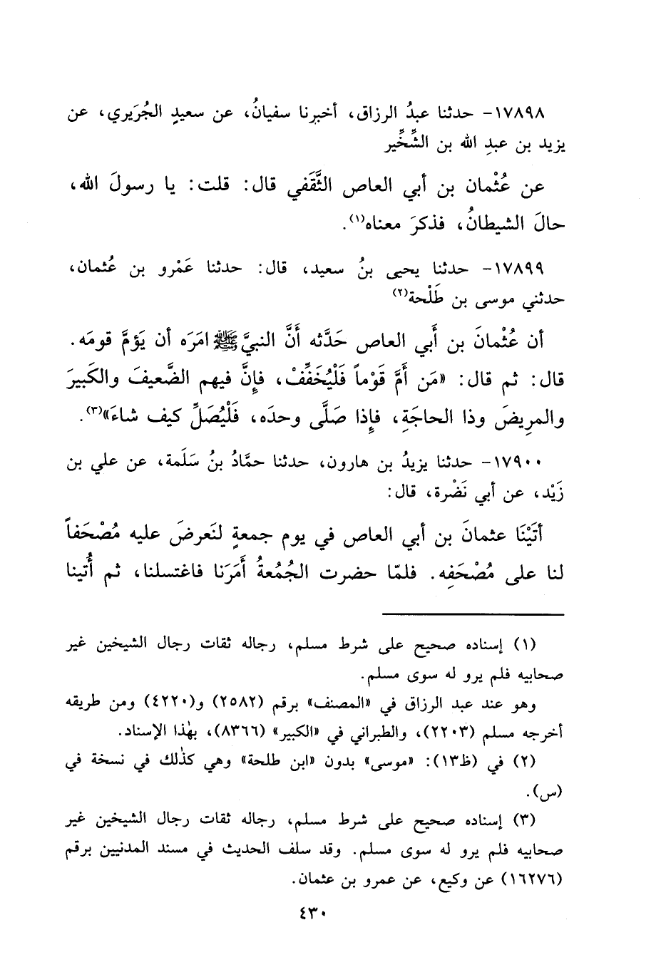١٧٨٩٩ - حَدَّثَنَا يَحْيَى بْنُ سَعِيدٍ، قَالَ: حَدَّثَنَا عَمْرُو بْنُ عُثْمَانَ، حَدَّثَنِي مُوسَى بْنُ طَلْحَةَ (٢) ، أَنَّ عُثْمَانَ بْنَ أَبِي الْعَاصِ، حَدَّثَهُ أَنَّ النَّبِيَّ صَلَّى اللهُ عَلَيْهِ وَسَلَّمَ، أَمَرَهُ أَنْ يَؤُمَّ قَوْمَهُ، قَالَ: ثُمَّ قَالَ: " مَنْ أَمَّ قَوْمًا فَلْيُخَفِّفْ، فَإِنَّ فِيهِمُ الضَّعِيفَ، وَالْكَبِيرَ، وَالْمَرِيضَ، وَذَا الْحَاجَةِ، فَإِذَا صَلَّى وَحْدَهُ فَلْيُصَلِّ كَيْفَ شَاءَ " (٣)