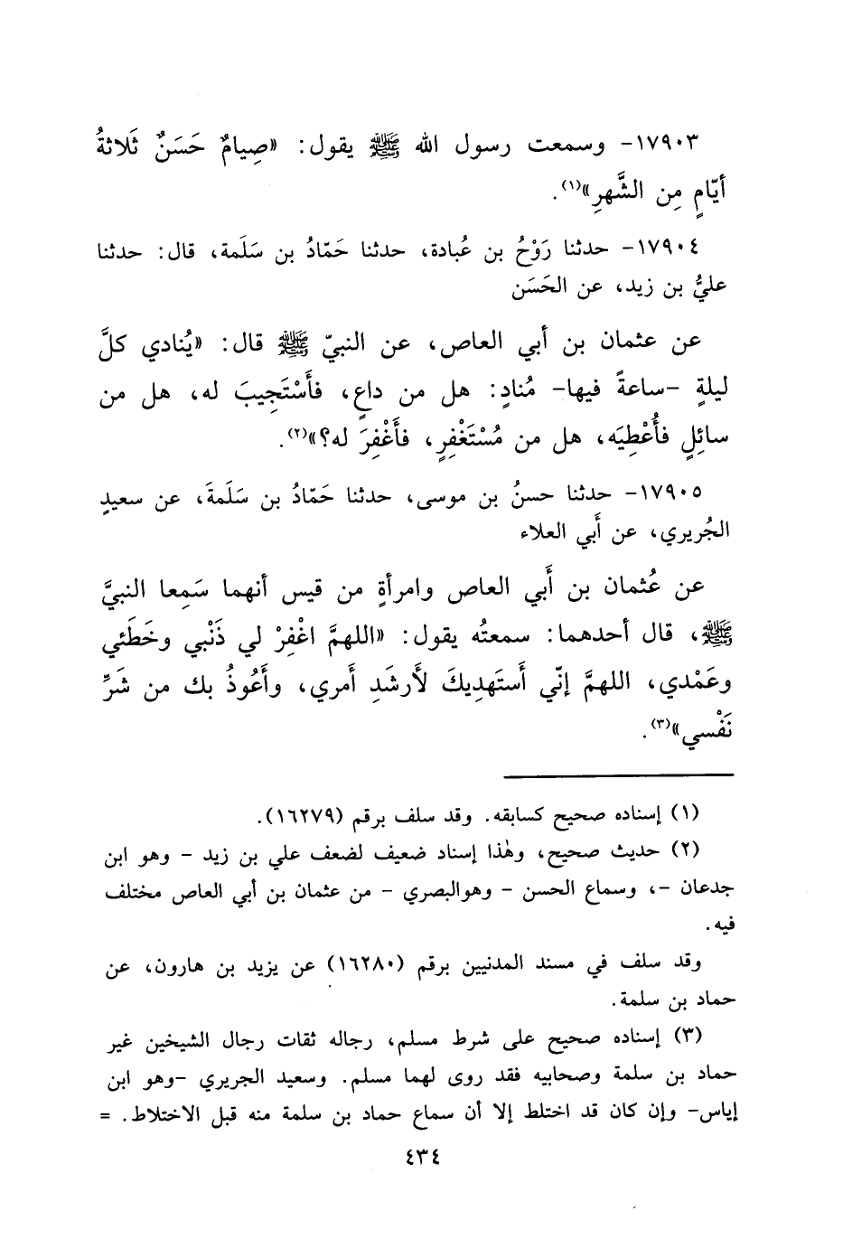 ١٧٩٠٤ - حَدَّثَنَا رَوْحُ بْنُ عُبَادَةَ، حَدَّثَنَا حَمَّادُ بْنُ سَلَمَةَ، قَالَ: حَدَّثَنَا عَلِيُّ بْنُ زَيْدٍ، عَنِ الْحَسَنِ، عَنْ عُثْمَانَ بْنِ أَبِي الْعَاصِ، عَنِ النَّبِيِّ صَلَّى اللهُ عَلَيْهِ وَسَلَّمَ قَالَ: " يُنَادِي كُلَّ لَيْلَةٍ سَاعَةً فِيهَا مُنَادٍ، هَلْ مِنْ دَاعٍ فَأَسْتَجِيبَ لَهُ؟ هَلْ مِنْ سَائِلٍ فَأُعْطِيَهُ؟ هَلْ مِنْ مُسْتَغْفِرٍ فَأَغْفِرَ لَهُ؟ " (٢)