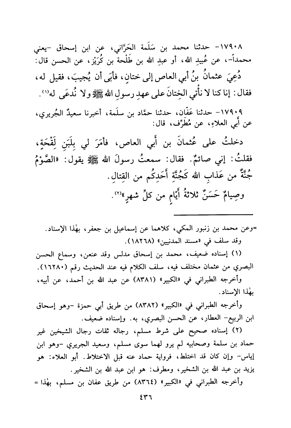 ١٧٩٠٨ - حَدَّثَنَا مُحَمَّدُ بْنُ سَلَمَةَ الْحَرَّانِيُّ، عَنْ ابْنِ إِسْحَاقَ يَعْنِي مُحَمَّدًا، عَنْ عُبَيِدِ اللهِ، أَوْ عَبْدِ اللهِ بْنِ طَلْحَةَ بْنِ كَرِيزٍ، عَنِ الْحَسَنِ، قَالَ: دُعِيَ عُثْمَانُ بْنُ أَبِي الْعَاصِ إِلَى خِتَانٍ، فَأَبَى أَنْ يُجِيبَ، فَقِيلَ لَهُ، فَقَالَ: " إِنَّا كُنَّا لَا نَأْتِي الْخِتَانَ عَلَى عَهْدِ رَسُولِ اللهِ صَلَّى اللهُ عَلَيْهِ وَسَلَّمَ وَلَا نُدْعَى لَهُ " (١)