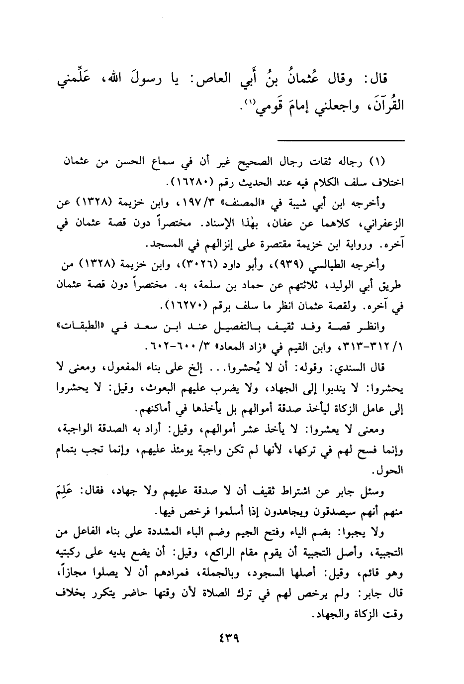 قَالَ: وَقَالَ عُثْمَانُ بْنُ أَبِي الْعَاصِ: يَا رَسُولَ اللهِ عَلِّمْنِي الْقُرْآنَ، وَاجْعَلْنِي إِمَامَ قَوْمِي (١)