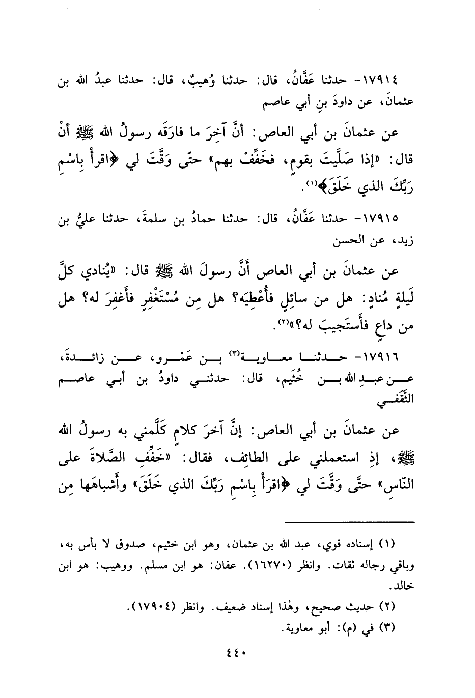 ١٧٩١٤ - حَدَّثَنَا عَفَّانُ، قَالَ: حَدَّثَنَا وُهَيْبٌ، قَالَ: حَدَّثَنَا عَبْدُ اللهِ بْنُ عُثْمَانَ، عَنْ دَاوُدَ بْنِ أَبِي عَاصِمٍ، عَنْ عُثْمَانَ بْنِ أَبِي الْعَاصِ، أَنَّ آخِرَ مَا فَارَقَهُ رَسُولُ اللهِ صَلَّى اللهُ عَلَيْهِ وَسَلَّمَ أَنْ قَالَ: " إِذَا صَلَّيْتَ بِقَوْمٍ فَخَفِّفْ بِهِمْ، حَتَّى وَقَّتَ لِي اقْرَأْ بِاسْمِ رَبِّكَ الَّذِي خَلَقَ " (١)