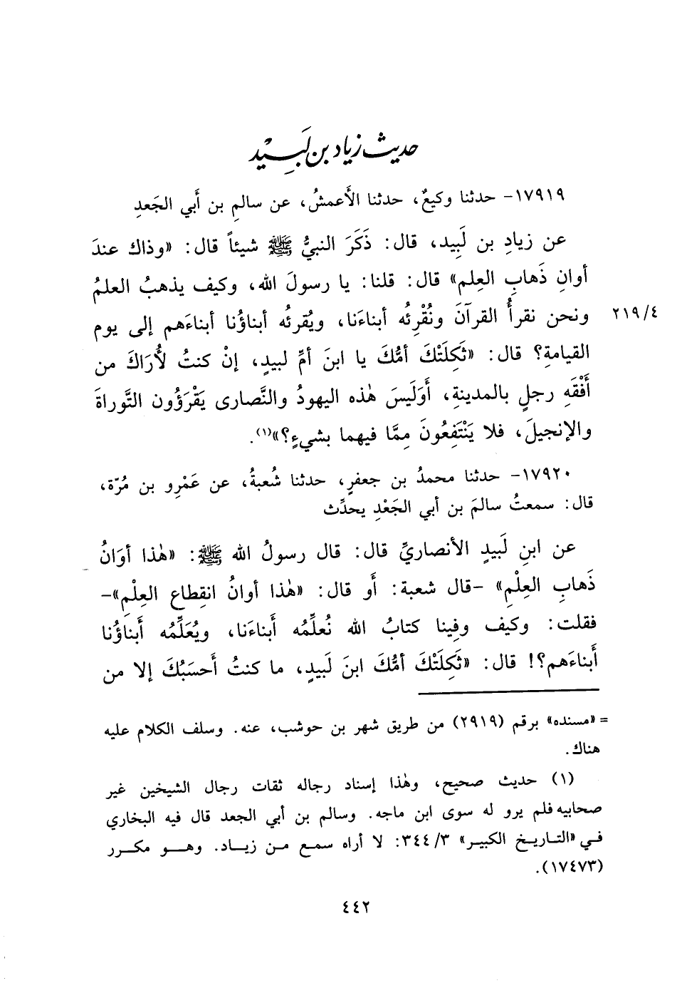 ١٧٩١٩ - حَدَّثَنَا وَكِيعٌ، حَدَّثَنَا الْأَعْمَشُ، عَنْ سَالِمِ بْنِ أَبِي الْجَعْدِ، عَنْ زِيَادِ بْنِ لَبِيدٍ، قَالَ: ذَكَرَ النَّبِيُّ صَلَّى اللهُ عَلَيْهِ وَسَلَّمَ شَيْئًا قَالَ: " وَذَاكَ عِنْدَ أَوَانِ ذَهَابِ الْعِلْمِ " قَالَ: قُلْنَا يَا رَسُولَ اللهِ، يَذْهَبُ الْعِلْمُ وَنَحْنُ نَقْرَأُ الْقُرْآنَ وَنُقْرِئُهُ أَبْنَاءَنَا، وَيُقْرِئُهُ أَبْنَاؤُنَا أَبْنَاءَهُمْ إِلَى يَوْمِ الْقِيَامَةِ؟ قَالَ: " ثَكِلَتْكَ أُمُّكَ يَا ابْنَ أُمِّ لَبِيدٍ، إِنْ كُنْتُ لَأَرَاكَ مِنْ أَفْقَهِ رَجُلٍ بِالْمَدِينَةِ، أَوَلَيْسَ هَذِهِ الْيَهُودُ وَالنَّصَارَى يَقْرَءُونَ التَّوْرَاةَ وَالْإِنْجِيلَ، فَلَا يَنْتَفِعُونَ مِمَّا فِيهِمَا بِشَيْءٍ " (١)
