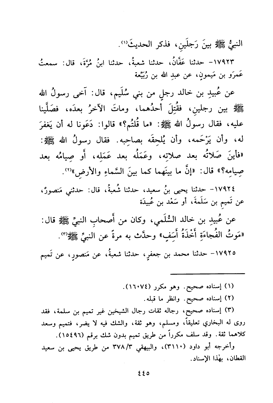 ١٧٩٢٣ - حَدَّثَنَا عَفَّانُ، حَدَّثَنَا شُعْبَةُ، حَدَّثَنَا ابْنُ مُرَّةَ، قَالَ: سَمِعْتُ عَمْرَو بْنَ مَيْمُونٍ، عَنْ عَبْدِ اللهِ بْنِ رَبِيعَةَ، عَنْ عُبَيْدِ بْنِ خَالِدٍ، رَجُلٌ مِنْ بَنِي سُلَيْمٍ قَالَ: آخَى رَسُولُ اللهِ صَلَّى اللهُ عَلَيْهِ وَسَلَّمَ بَيْنَ رَجُلَيْنِ، فَقُتِلَ أَحَدُهُمَا، وَمَاتَ الْآخَرُ بَعْدَهُ، فَصَلَّيْنَا عَلَيْهِ، فَقَالَ رَسُولُ اللهِ صَلَّى اللهُ عَلَيْهِ وَسَلَّمَ: " مَا قُلْتُمْ؟ " قَالُوا: دَعَوْنَا لَهُ أَنْ يَغْفِرَ لَهُ، وَأَنْ يَرْحَمَهُ، وَأَنْ يُلْحِقَهُ بِصَاحِبِهِ. فَقَالَ رَسُولُ اللهِ صَلَّى اللهُ عَلَيْهِ وَسَلَّمَ: " فَأَيْنَ صَلَاتُهُ بَعْدَ صَلَاتِهِ، وَعَمَلُهُ بَعْدَ عَمَلِهِ، أَوْ صِيَامُهُ بَعْدَ صِيَامِهِ؟ " قَالَ: " إِنَّ مَا بَيْنَهُمَا كَمَا بَيْنَ السَّمَاءِ وَالْأَرْضِ " (٢)