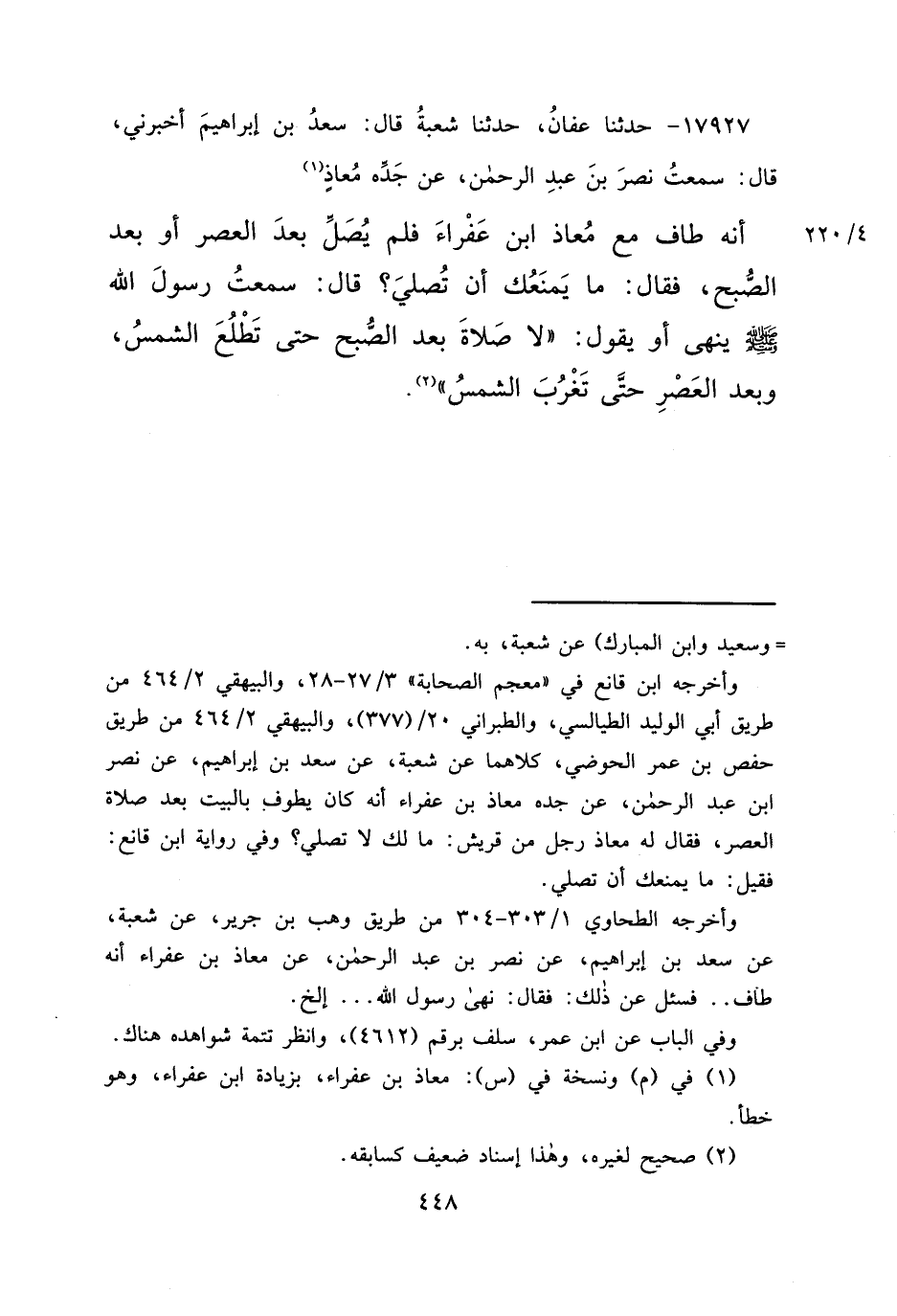 ١٧٩٢٧ - حَدَّثَنَا عَفَّانُ، حَدَّثَنَا شُعْبَةُ، قَالَ سَعْدُ بْنُ إِبْرَاهِيمَ: أَخْبَرَنِي قَالَ: سَمِعْتُ نَصْرَ بْنَ عَبْدِ الرَّحْمَنِ، عَنْ جَدِّهِ مُعَاذِ (١) ، أَنَّهُ طَافَ مَعَ مُعَاذِ ابْنِ عَفْرَاءَ فَلَمْ يُصَلِّ بَعْدَ الْعَصْرِ، أَوْ بَعْدَ الصُّبْحِ، فَقَالَ: مَا يَمْنَعُكَ أَنْ تُصَلِّيَ؟ قَالَ: سَمِعْتُ رَسُولَ اللهِ صَلَّى اللهُ عَلَيْهِ وَسَلَّمَ يَنْهَى، أَوْ يَقُولُ: " لَا صَلَاةَ بَعْدَ الصُّبْحِ حَتَّى تَطْلُعَ الشَّمْسُ، وَبَعْدَ الْعَصْرِ حَتَّى تَغْرُبَ الشَّمْسُ " (٢)