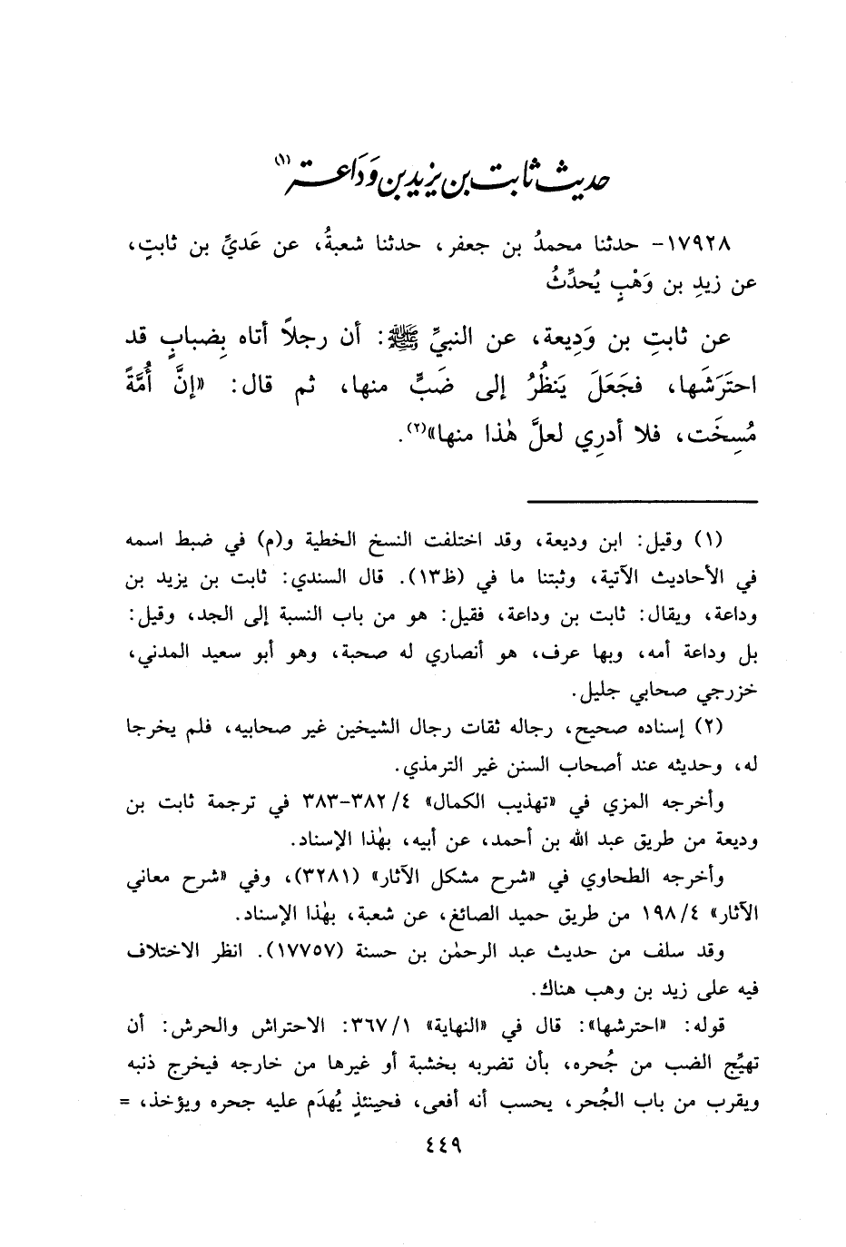 ١٧٩٢٨ - حَدَّثَنَا مُحَمَّدُ بْنُ جَعْفَرٍ، حَدَّثَنَا شُعْبَةُ، عَنْ عَدِيِّ بْنِ ثَابِتٍ، عَنْ زَيْدِ بْنِ وَهْبٍ، يُحَدِّثُ عَنْ ثَابِتِ ابْنِ وَدِيعَةَ، عَنِ النَّبِيِّ صَلَّى اللهُ عَلَيْهِ وَسَلَّمَ: أَنَّ رَجُلًا أَتَاهُ بِضِبَابٍ قَدِ احْتَرَشَهَا، فَجَعَلَ يَنْظُرُ إِلَى ضَبٍّ مِنْهَا، ثُمَّ قَالَ: " إِنَّ أُمَّةً مُسِخَتْ فَلَا أَدْرِي لَعَلَّ هَذَا مِنْهَا " (٢)