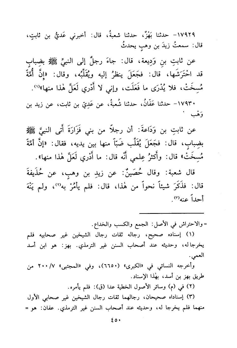 ١٧٩٢٩ - حَدَّثَنَا بَهْزٌ، حَدَّثَنَا شُعْبَةُ، قَالَ: أَخْبَرَنِي عَدِيُّ بْنُ ثَابِتٍ، قَالَ: سَمِعْتُ زَيْدَ بْنَ وَهْبٍ، يُحَدِّثُ عَنْ ثَابِتِ ابْنِ وَدِيعَةَ، قَالَ: جَاءَ رَجُلٌ إِلَى النَّبِيِّ صَلَّى اللهُ عَلَيْهِ وَسَلَّمَ بِضِبَابٍ قَدِ احْتَرَشَهَا، قَالَ: فَجَعَلَ يَنْظُرُ إِلَيْهِ وَيُقَلِّبُهُ، وَقَالَ: " إِنَّ أُمَّةً مُسِخَتْ فَلَا يُدْرَى مَا فَعَلَتْ، وَإِنِّي لَا أَدْرِي لَعَلَّ هَذَا مِنْهَا " (١)