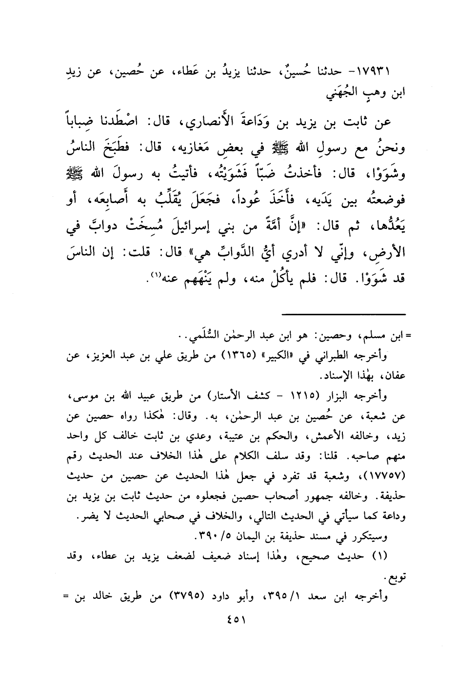 ١٧٩٣١ - حَدَّثَنَا حُسَيْنٌ، حَدَّثَنَا يَزِيدُ بْنُ عَطَاءٍ، عَنْ حُصَيْنٍ، عَنْ زَيْدِ بْنِ وَهْبٍ الْجُهَنِيِّ، عَنْ ثَابِتِ بْنِ يَزِيدَ ابْنِ وَدَاعَةَ الْأَنْصَارِيِّ، قَالَ: اصْطَدْنَا ضِبَابًا وَنَحْنُ مَعَ رَسُولِ اللهِ صَلَّى اللهُ عَلَيْهِ وَسَلَّمَ فِي بَعْضِ مَغَازِيهِ، قَالَ: فَطَبَخَ النَّاسُ وَشَوَوْا، قَالَ: فَأَخَذْتُ ضَبًّا فَشَوَيْتُهُ، فَأَتَيْتُ بِهِ رَسُولَ اللهِ صَلَّى اللهُ عَلَيْهِ وَسَلَّمَ فَوَضَعَهُ بَيْنَ يَدَيْهِ، فَأَخَذَ عُودًا، فَجَعَلَ يُقَلِّبُ بِهِ أَصَابِعَهُ، أَوْ يَعُدُّهَا، ثُمَّ قَالَ: " إِنَّ أُمَّةً مِنْ بَنِي إِسْرَائِيلَ مُسِخَتْ دَوَابَّ فِي الْأَرْضِ، وَإِنِّي لَا أَدْرِي أَيَّ الدَّوَابِّ هِيَ " قَالَ: قُلْتُ: إِنَّ النَّاسَ قَدْ شَوَوْا، قَالَ: فَلَمْ يَأْكُلْ مِنْهُ، وَلَمْ يَنْهَهُمْ عَنْهُ (١)