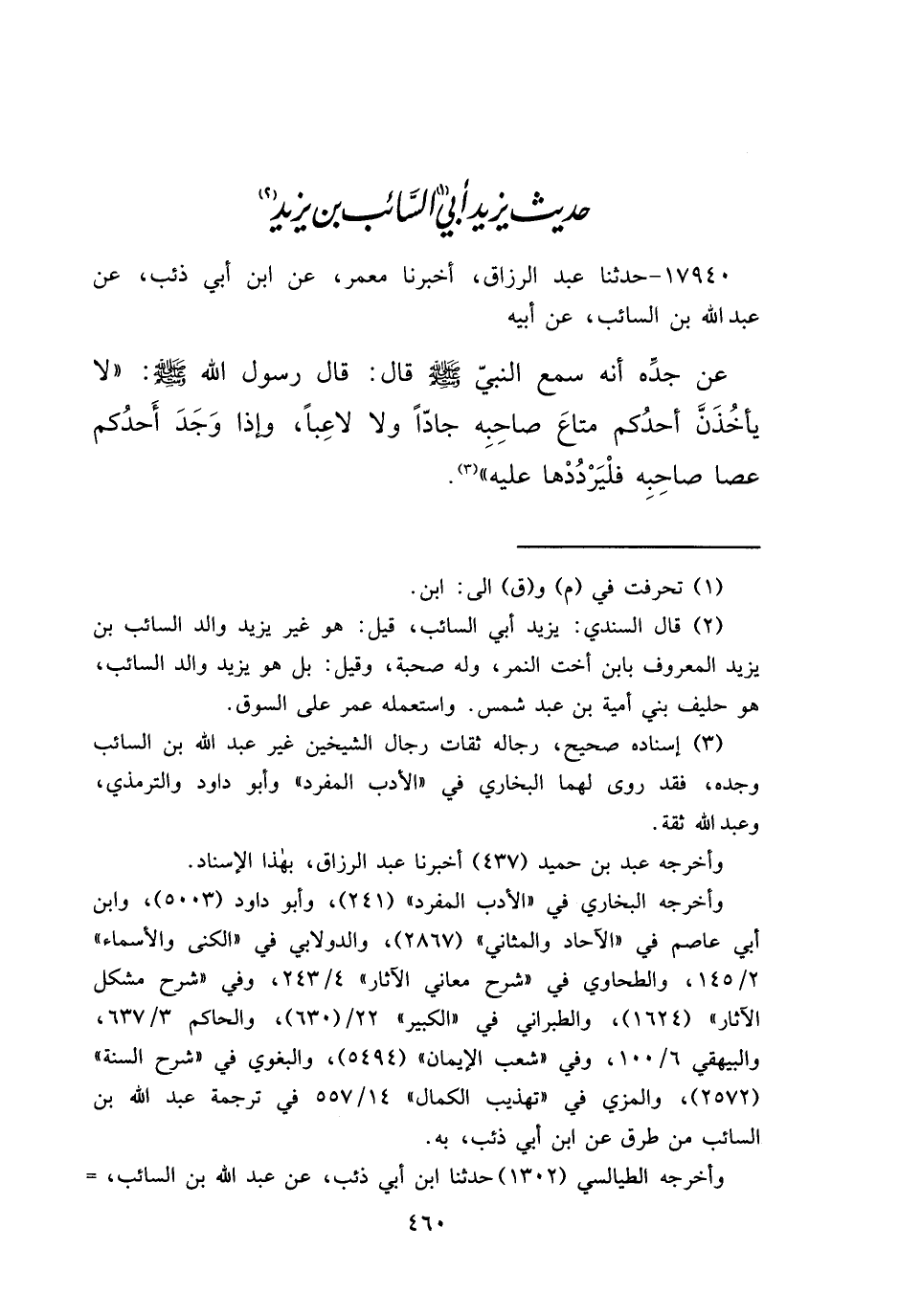 ١٧٩٤٠ - حَدَّثَنَا عَبْدُ الرَّزَّاقِ، أَخْبَرَنَا مَعْمَرٌ، عَنِ ابْنِ أَبِي ذِئْبٍ، عَنْ عَبْدِ اللهِ بْنِ السَّائِبِ، عَنْ أَبِيهِ، عَنْ جَدِّهِ، أَنَّهُ سَمِعَ النَّبِيَّ صَلَّى اللهُ عَلَيْهِ وَسَلَّمَ قَالَ: قَالَ رَسُولُ اللهِ صَلَّى اللهُ عَلَيْهِ وَسَلَّمَ: " لَا يَأْخُذَنَّ أَحَدُكُمْ مَتَاعَ صَاحِبِهِ جَادًّا وَلَا لَاعِبًا، وَإِذَا وَجَدَ أَحَدُكُمْ عَصَا صَاحِبِهِ فَلْيَرْدُدْهَا عَلَيْهِ " (٣)