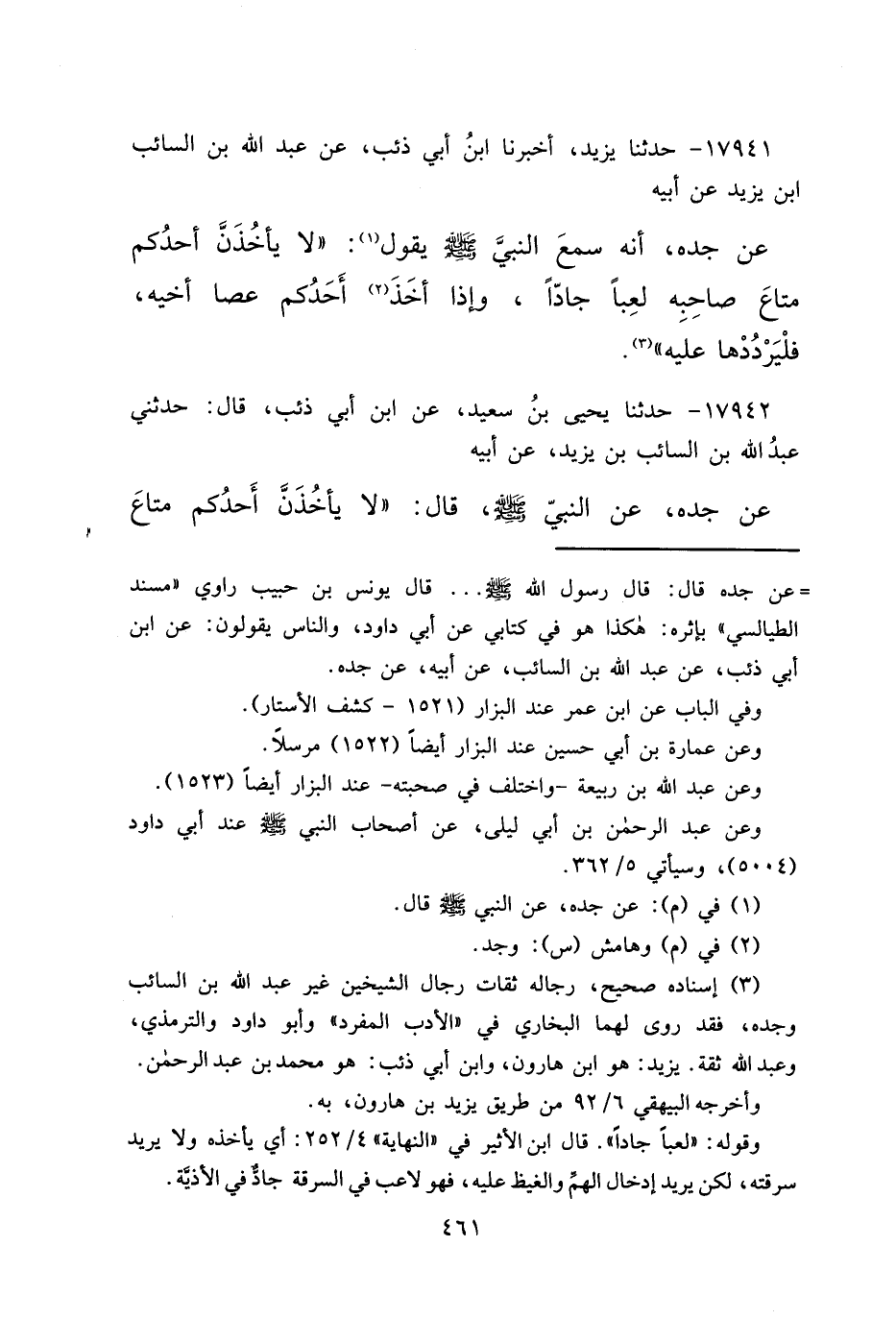 ١٧٩٤١ - حَدَّثَنَا يَزِيدُ، أَخْبَرَنَا ابْنُ أَبِي ذِئْبٍ، عَنْ عَبْدِ اللهِ بْنِ السَّائِبِ بْنِ يَزِيدَ، عَنْ أَبِيهِ، عَنْ جَدِّهِ، أَنَّهُ سَمِعَ النَّبِيِّ صَلَّى اللهُ عَلَيْهِ وَسَلَّمَ يَقولُ (١) : " لَا يَأْخُذَنَّ أَحَدُكُمْ مَتَاعَ صَاحِبِهِ لَعِبًا جَادًّا، وَإِذَا أَخَذَ (٢) أَحَدُكُمْ عَصَا أَخِيهِ، فَلْيَرْدُدْهَا عَلَيْهِ " (٣)