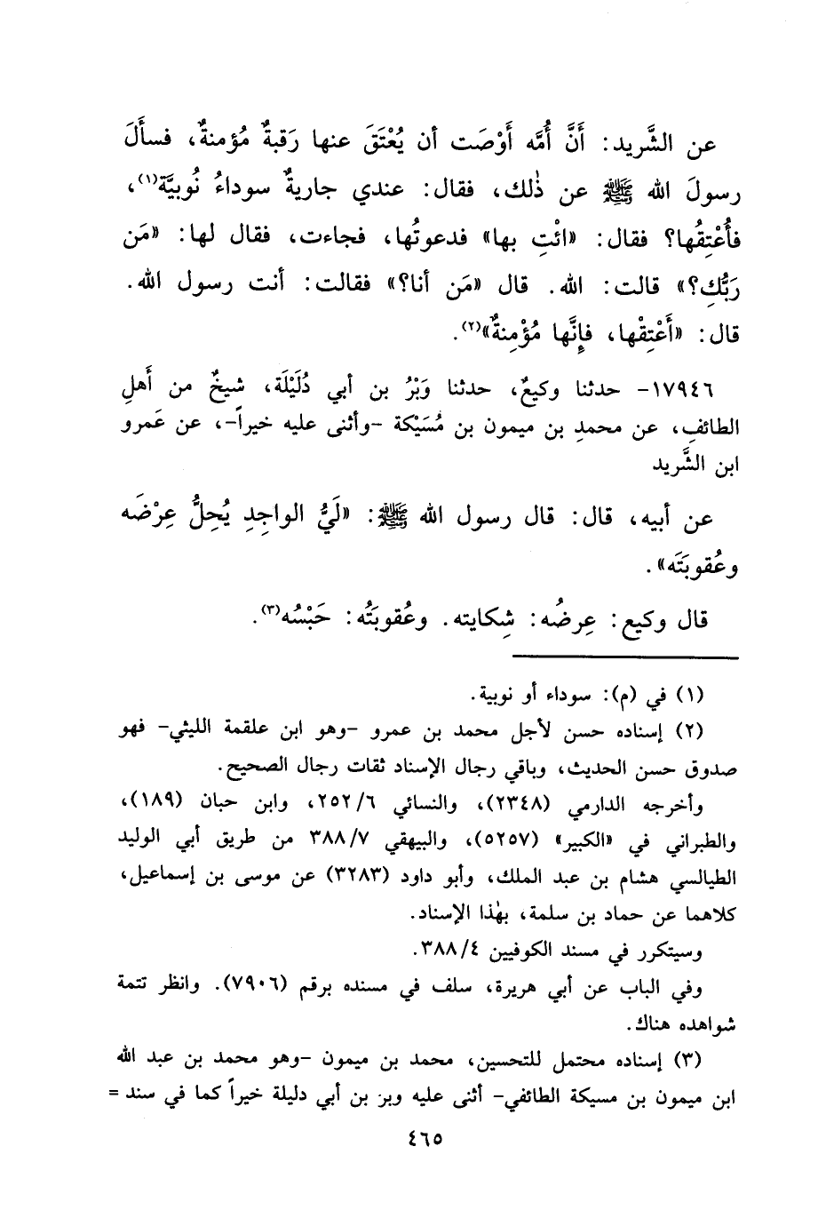 ١٧٩٤٦ - حَدَّثَنَا وَكِيعٌ، حَدَّثَنَا وَبْرُ بْنُ أَبِي دُلَيْلَةَ، شَيْخٌ مِنْ أَهْلِ الطَّائِفِ، عَنْ مُحَمَّدِ بْنِ مَيْمُونِ بْنِ مُسَيْكَةَ، - وَأَثْنَى عَلَيْهِ خَيْرًا -، عَنْ عَمْرِو بْنِ الشَّرِيدِ، عَنْ أَبِيهِ، قَالَ: قَالَ رَسُولُ اللهِ صَلَّى اللهُ عَلَيْهِ وَسَلَّمَ: " لَيُّ الْوَاجِدِ يُحِلُّ عِرْضَهُ، وَعُقُوبَتَهُ " قَالَ وَكِيعٌ: " عِرْضُهُ: شِكَايَتُهُ، وَعُقُوبَتُهُ: حَبْسُهُ " (٣)