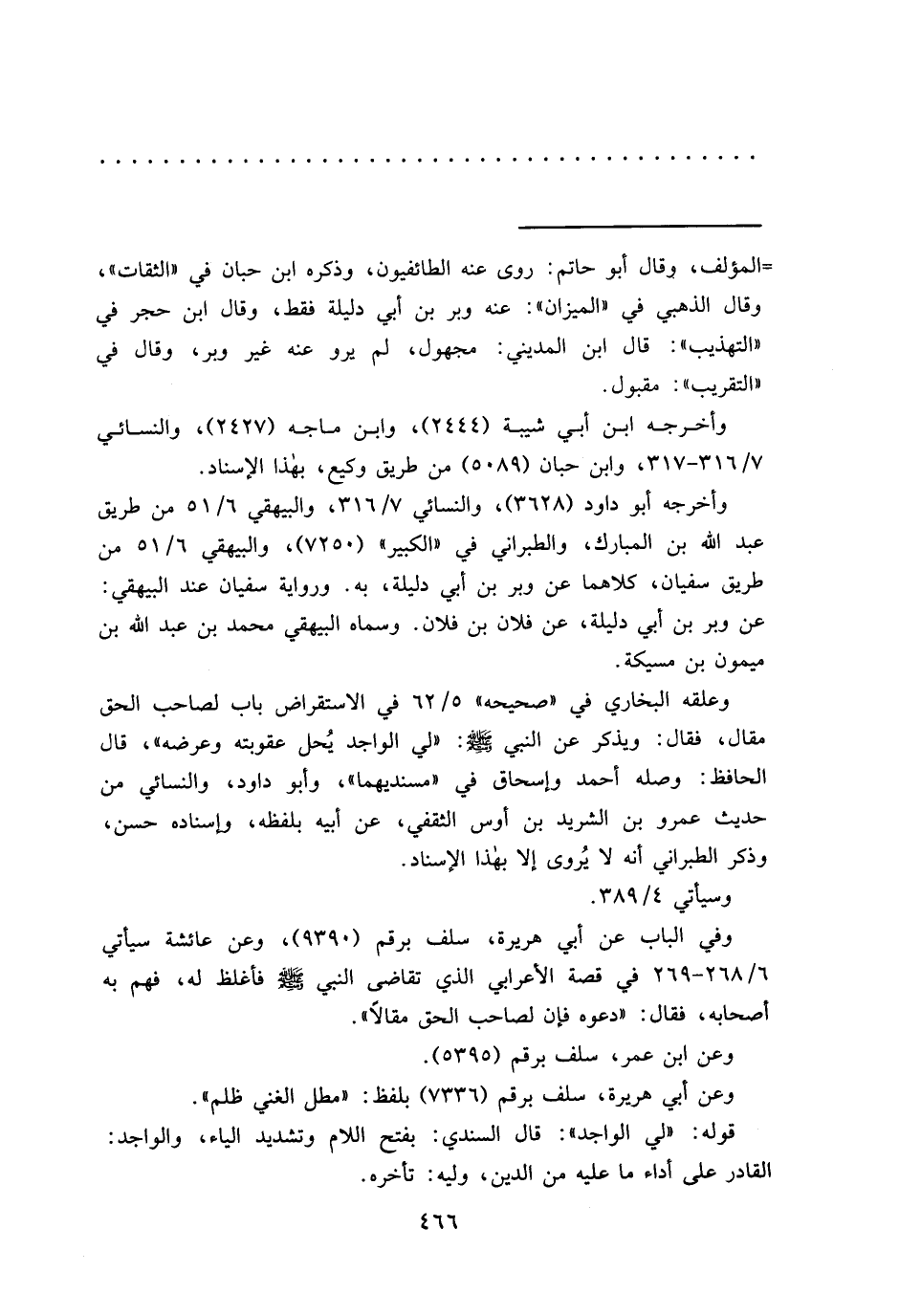 وعلقه البخاري في "صحيحه" ٥/٦٢ في الاستقراض باب لصاحب الحق مقال، فقال: ويذكر عن النبي صَلَّى اللهُ عَلَيْهِ وَسَلَّمَ: "لي الواجد يُحل عقوبته وعرضه"، قال الحافظ: وصله أحمد وإسحاق في "مسنديهما"، وأبو داود، والنسائي من حديث عمرو بن الشريد بن أوس الثقفي، عن أبيه بلفظه، وإسناده حسن، وذكر الطبراني أنه لا يُروى إلا بهذا الإسناد.