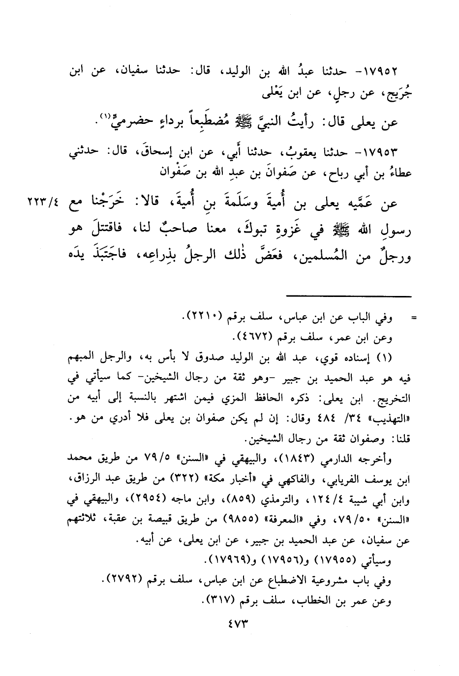 ١٧٩٥٢ - حَدَّثَنَا عَبْدُ اللهِ بْنُ الْوَلِيدِ، قَالَ: حَدَّثَنَا سُفْيَانُ، عَنِ ابْنِ جُرَيْجٍ، عَنْ رَجُلٍ، عَنْ ابْنِ يَعْلَى، عَنْ يَعْلَى، قَالَ: " رَأَيْتُ النَّبِيَّ صَلَّى اللهُ عَلَيْهِ وَسَلَّمَ مُضْطَبِعًا بِرِدَاءٍ حَضْرَمِيٍّ " (١)