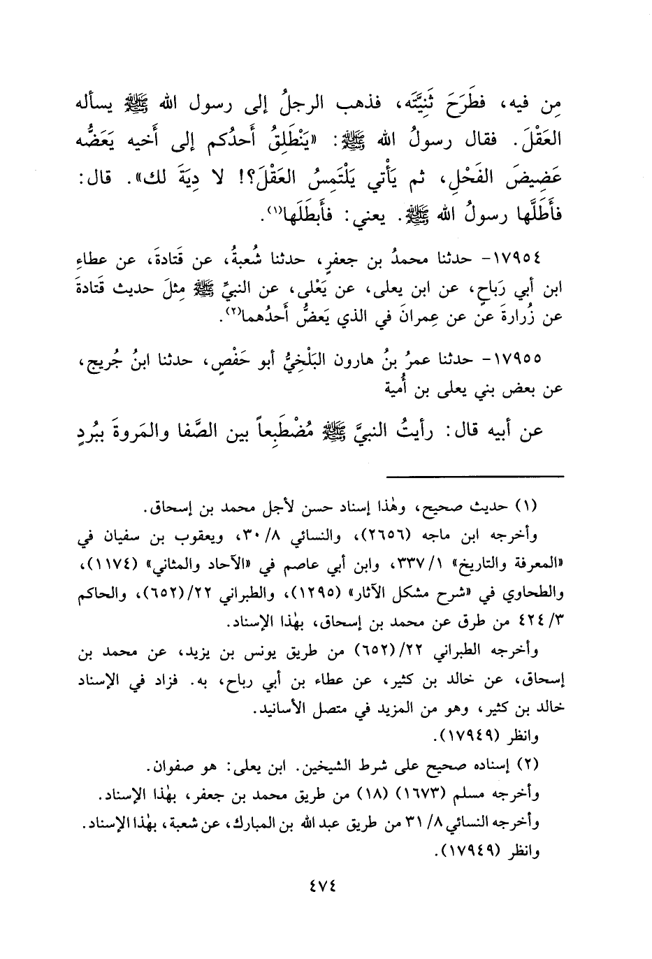 ١٧٩٥٤ - حَدَّثَنَا مُحَمَّدُ بْنُ جَعْفَرٍ، حَدَّثَنَا شُعْبَةُ، عَنْ قَتَادَةَ، عَنْ عَطَاءِ بْنِ أَبِي رَبَاحٍ، عَنِ ابْنِ يَعْلَى، عَنْ يَعْلَى، عَنِ النَّبِيِّ صَلَّى اللهُ عَلَيْهِ وَسَلَّمَ مِثْلَ حَدِيثِ قَتَادَةَ، عَنْ زُرَارَةَ، عَنْ عِمْرَانَ فِي الَّذِي يُعَضُّ أَحَدُهُمَا (٢)