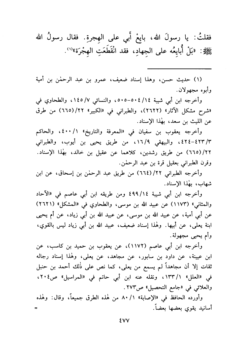 فَقُلْتُ: يَا رَسُولَ اللهِ بَايِعْ أَبِي عَلَى الْهِجْرَةِ، فَقَالَ رَسُولُ اللهِ صَلَّى اللهُ عَلَيْهِ وَسَلَّمَ: " بَلْ أُبَايِعُهُ عَلَى الْجِهَادِ فَقَدِ انْقَطَعَتِ الْهِجْرَةُ " (١)